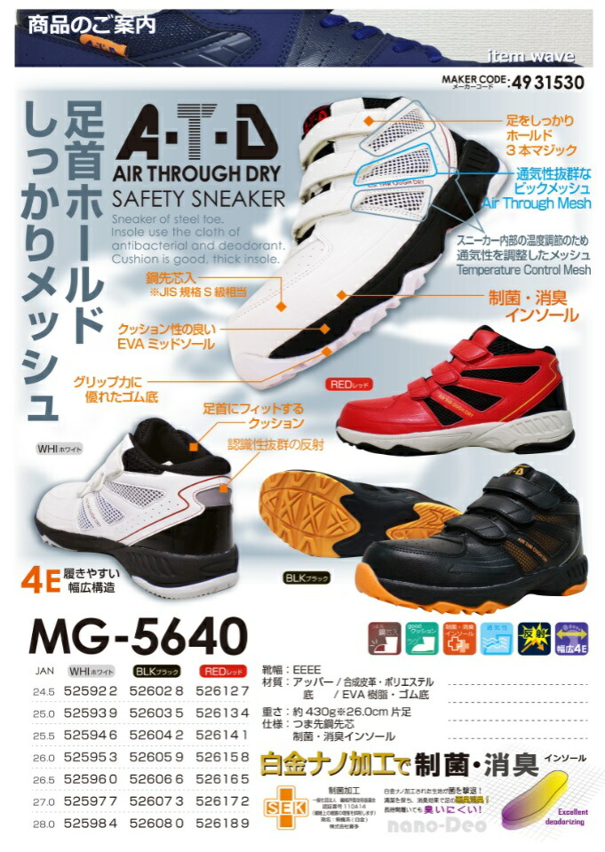 MG5640 BLK ブラック足首ホールドしっかりメッシュ鋼先芯:JIS規格S級相当白金ナノ加工で制菌・消臭インソール■足をしっかりホールド3本マジック■通気性抜群なビックメッシュ■スニーカー内部の湿度調節のため通気性を調節したメッシュ■クッション性の良いEVAミッドソール■グリップ力に優れたゴム底■足首にフィットするクッション■認識性抜群の反射・靴底:EEEE・材質:アッパー/合成皮革・ポリエステル底/EVA樹脂・ゴム底・重さ:約430g※26.0cm片足・仕様:つま先鋼先芯・制菌・消臭インソール白金ナノ加工された生地が菌を撃退!清潔を保ち、消臭効果で足の悪臭消臭!長時間履いていても臭いにくい!