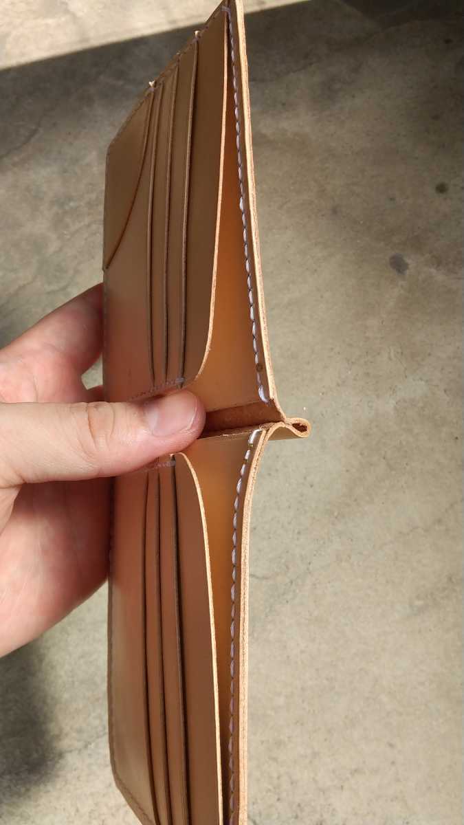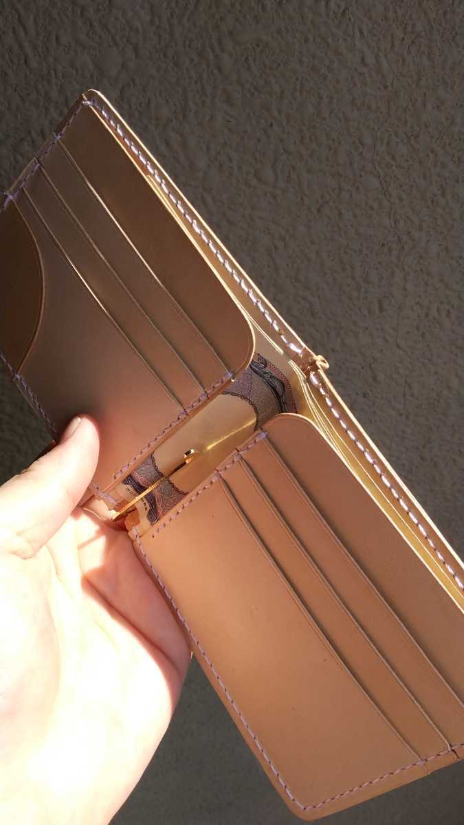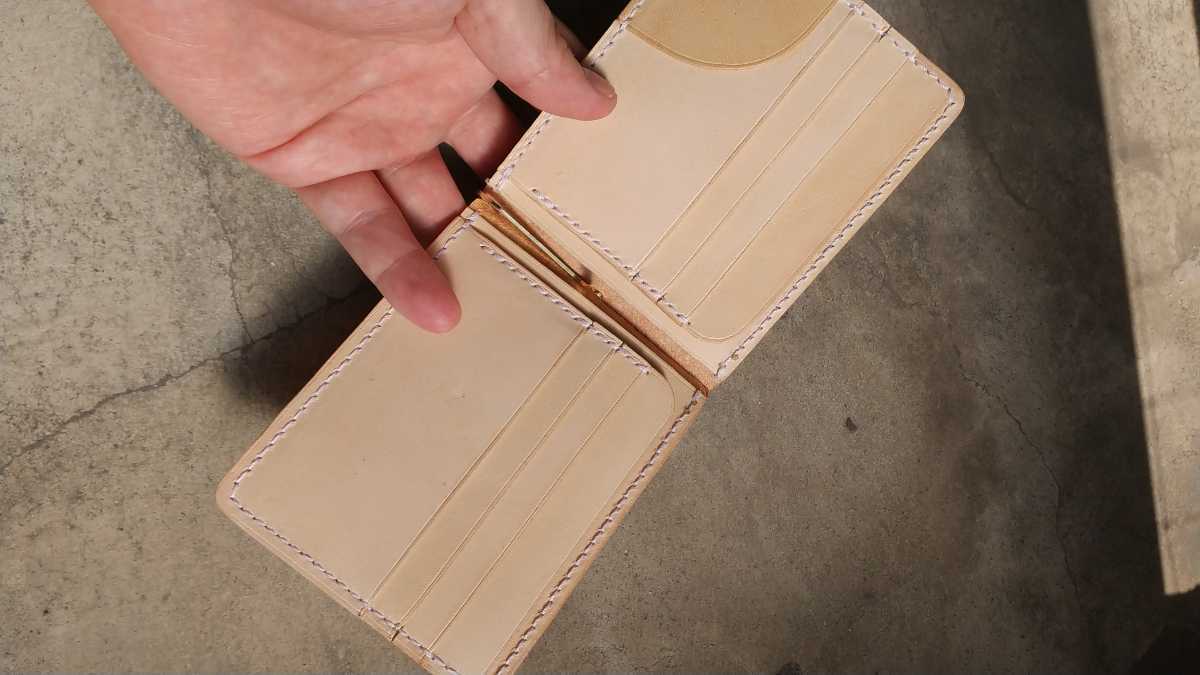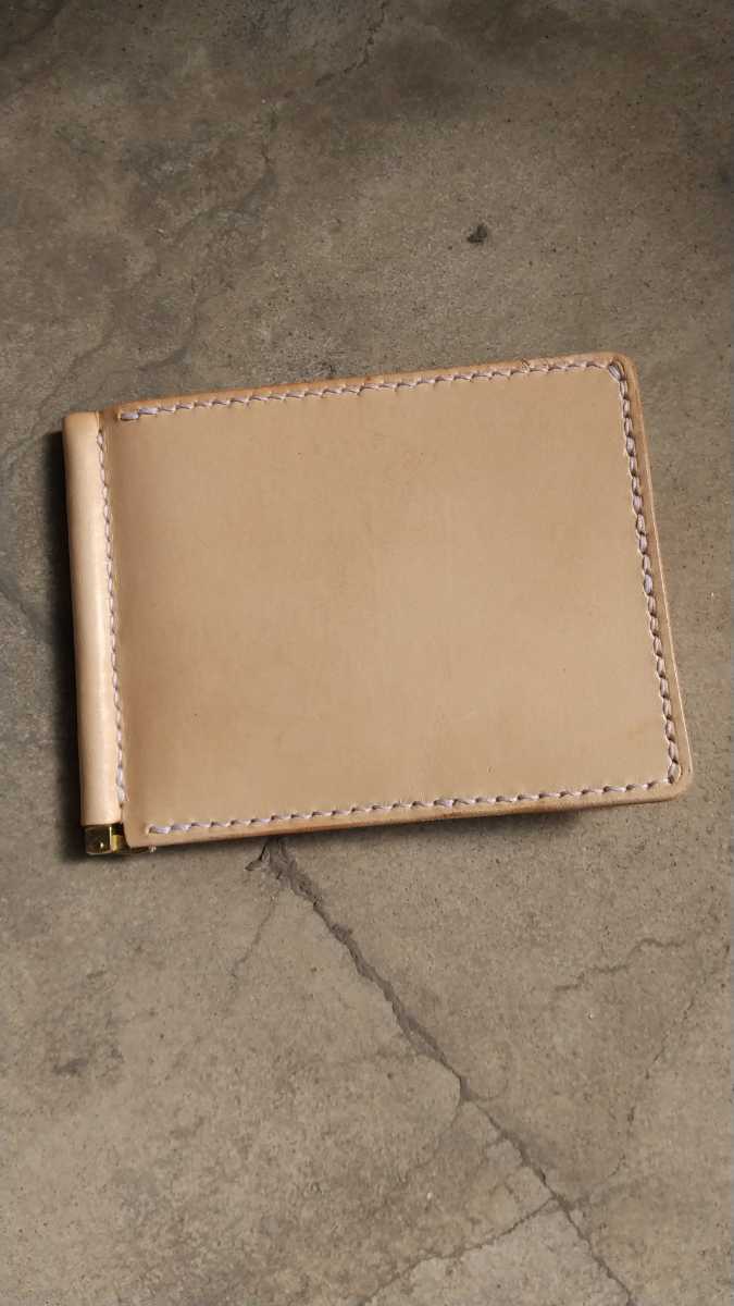 こちらは、ナチュラルカラーのヌメ革を丈夫なポリエステル系の白糸で手縫いで仕立てたマネークリップになります。