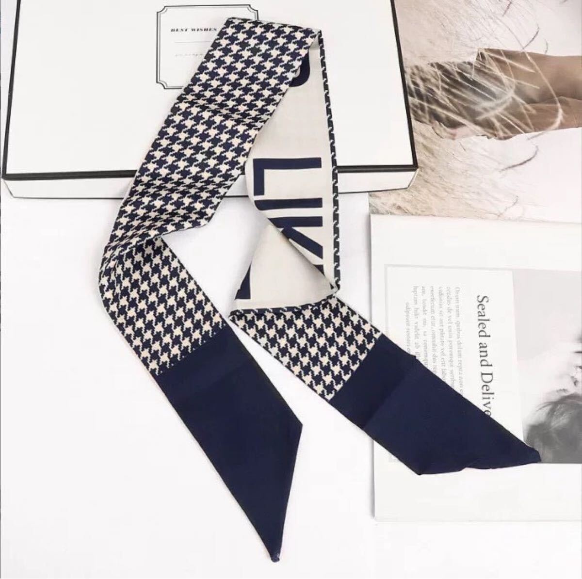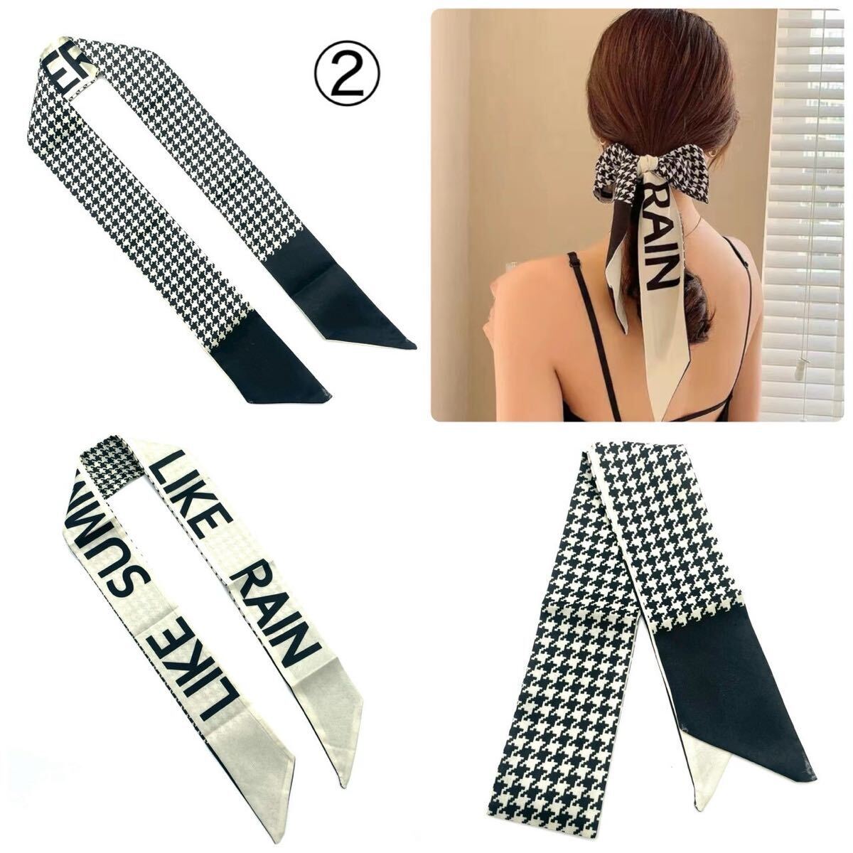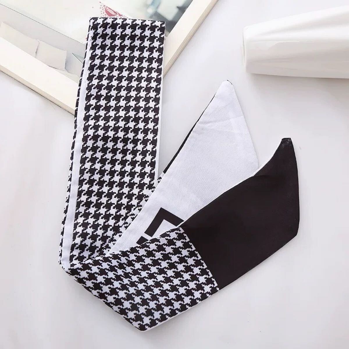 ・モノトーンの千鳥格子×英字ロゴが目を引く、おしゃれなリバーシブルリボンスカーフ。