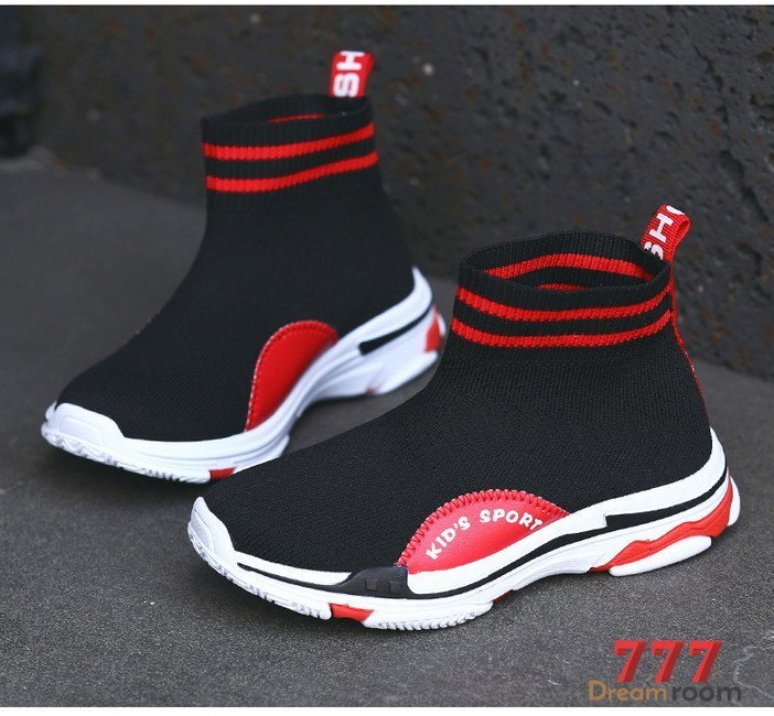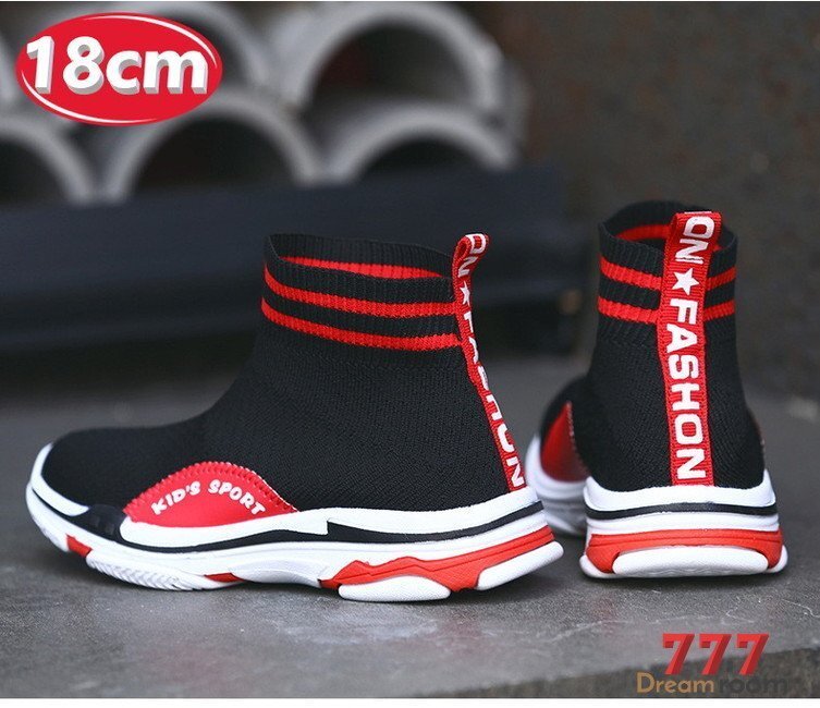 kids 夏用 ハイカット スニーカー 【ブラック×レッド 18cm】 韓国子供服 キッズ シューズ ニットスニーカー 子供用 男女