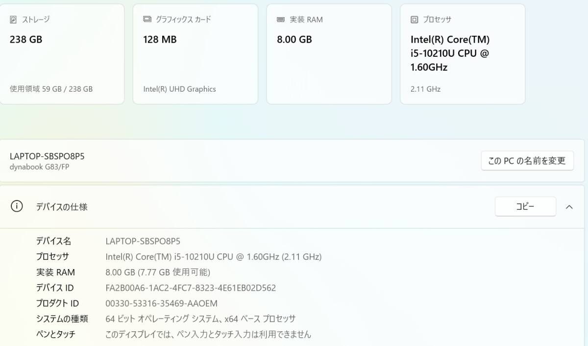 【バッテリー良好/良品】dynabook G83/FP i5-10210U 10世代 メモリ 8GB SSD 256GB 13.3型 Windows11 Pro office2024