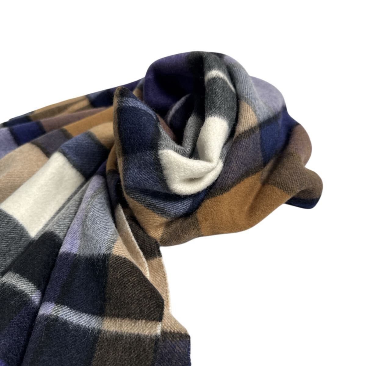 幅広の大判サイズ(約71.5cm幅)ですので、首に巻くだけでなく、肩掛けのショールや、オフィスや自宅での**ひざ掛け(ブランケット)**としても贅沢にご活用いただけます。