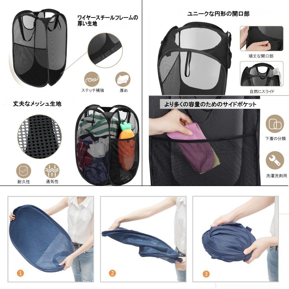 丈夫で柔軟なメッシュで作られており、通常のランドリー バッグやバスケットよりも多くの衣類を収納できます。サイドには仕分け用のポケットがあり、下着や靴下などを分けて収納できます。