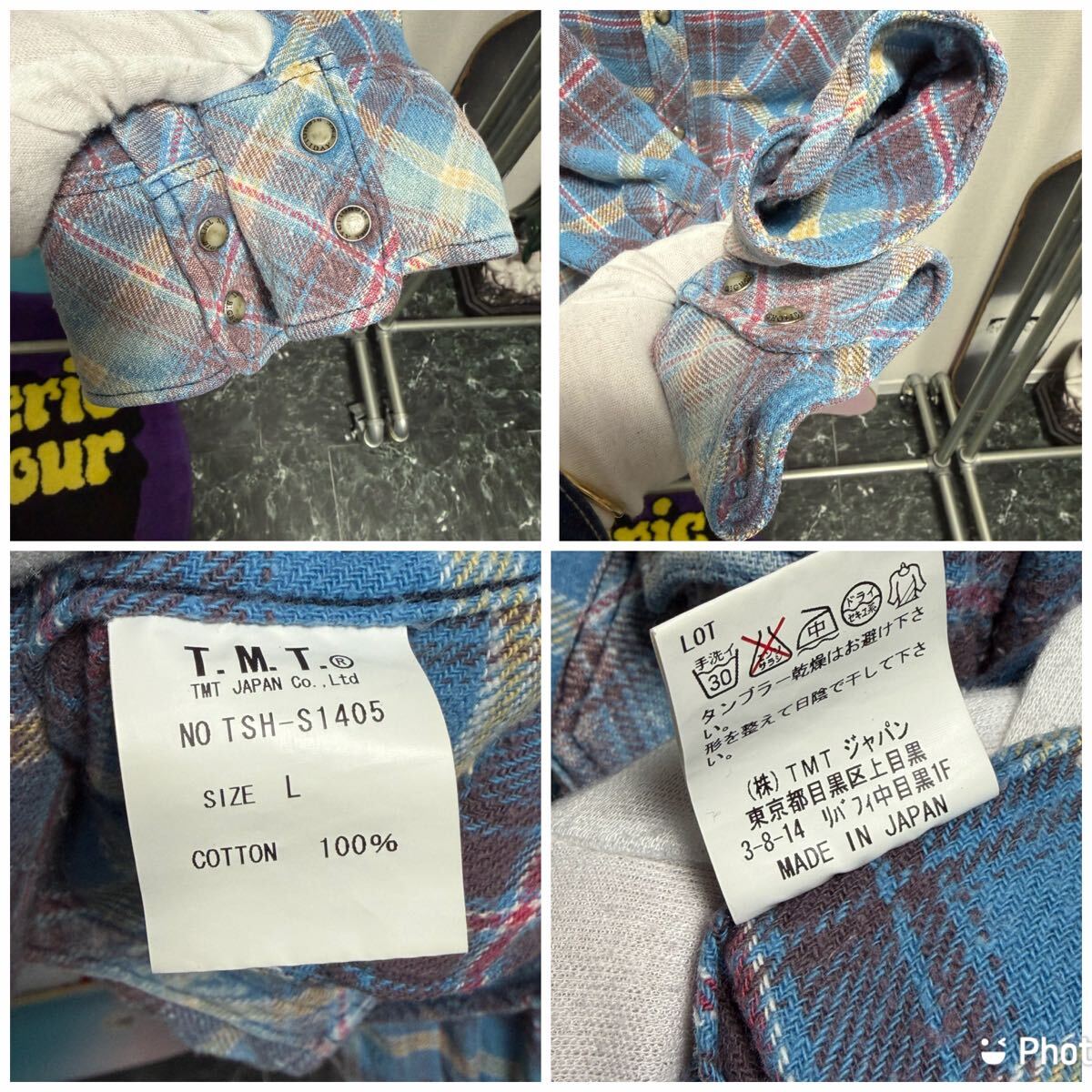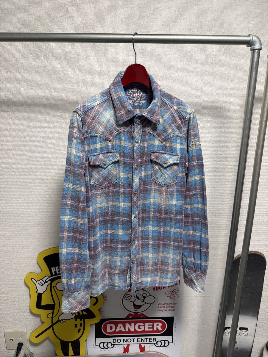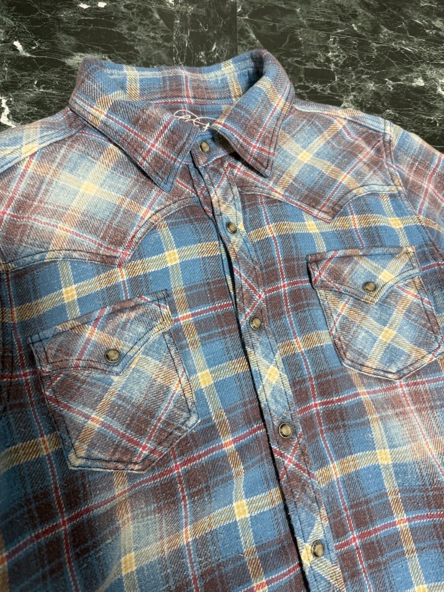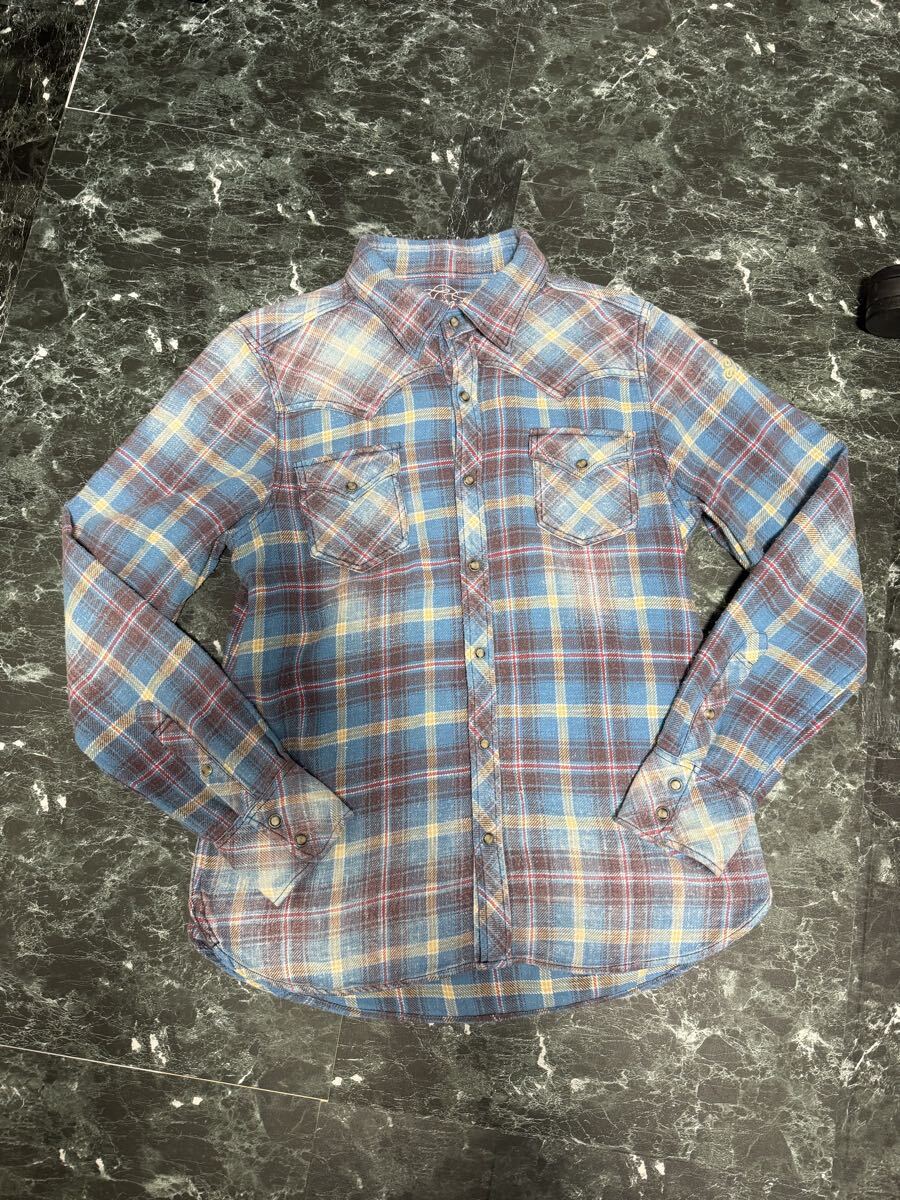 TMTのダメージ加工インディゴチェックウエスタンネルシャツになります!