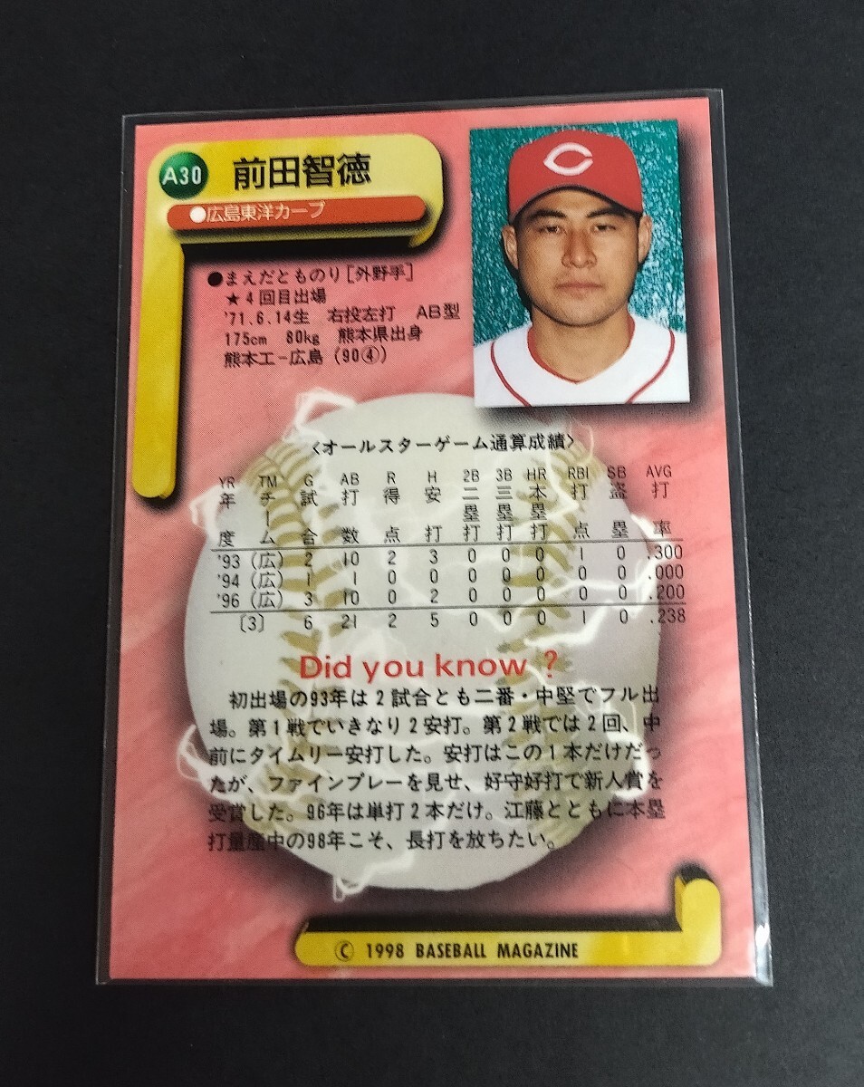 1998年BBM オールスター 前田智徳(広島) No,A30。※表面、細かいスレ傷、裏面、初期スレ跡(画像3、4)