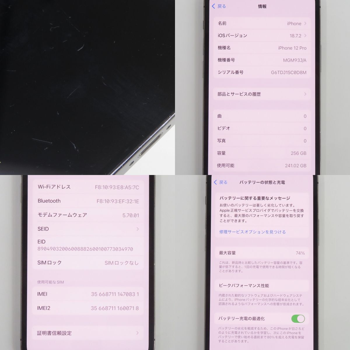 111 SIMフリー iPhone 12 Pro 256GB MGM93J/A グラファイト バッテリー最大容量74% ※中古/現状品/利用○ □付属品:本体のみ ※画像にあるもので全てです。 □型番:MGM93J/A □IMEI:356687111470831 □キャリア:SIMフリー(元Softbank) □シリアル番号:G6TDJ1SC0D8M □保証状況:保証期限切れ(2024年8月4日に期限切れ) □ファームウェア:5.70.01 □バージョン:18.7.2 □カラー:グラファイト □利用制限確認結果:○(2025.11.16時点) ※元のキャリアで利用判定が『○』と出ますが、SIMロック解除済みです。 □現状品内容 ・バッテリーの最大容量は74%です。 ※上記の理由により現状品として出品しております。 ※その他、把握できていない内容がある場合があります。 ※あくまで現状品として出品をしているため、記載にない不良個所があったり、 お客様に商品が届いた際に動作不良になりましても返金などでの対応は出来かねます。 ご理解・ご納得いただける方のみご購入ください。 □動作確認内容 初期化済み。 起動から初期化までの簡易的な動作確認済み。 □状態 ・外装にはキズや、ヨゴレ、若干の塗装ハゲ等の使用感があります。 ・液晶には全体的にキズがあります。 □水没反応:なし □備考:なし ※こちらの商品はSIMフリー端末ですが、全ての周波数帯に対応している訳ではございません。 事前にご確認の上ご購入ください。 [格安SIMでのご使用を考えているお客様へ] 当店は携帯電話本体のリサイクルショップですので、格安SIMのご使用方法については分かりかねます。 格安SIMの使用可否や設定方法などは、SIMカード提供元へお問い合わせ頂きます様、お願い致します。 また、格安SIMの読み込みエラーや、格安SIMご使用時の動作不良による返品は受け付けておりません。 予めご納得いただいた上、ご購入ください。 ※あくまで現状品として出品をしているため、記載にない不良個所や動作不良があったとしても返金などでの対応は出来かねます。 ですが、商品到着後にもしロックなどがかかりましたら必ず1週間以内にお知らせください。 その際はご返品・ご返金にて対応をさせていただきます。 ※商品の性質上、各種機能・ネットワークについてなどの詳細な確認はできておりません。 ※保証のない中古品であることをご理解いただける方のみご購入ください。 ※如何なる場合においても修理、代替え品への交換、用意には対応できません。 ※ご返金は商品を確認させていただいてからの対応となりますのでご了承ください。 ※この携帯端末を不正利用する為にご購入をお考えの方は、ご購入をお控えください。 ※ご購入後、端末の不正利用が発覚し情報の提供を要求された場合は、躊躇なく第3者への情報提供を提示いたします。 ※画像では判別しづらいUSED品特有の薄い汚れや薄いキズ、細かいキズなどある場合があります。 |