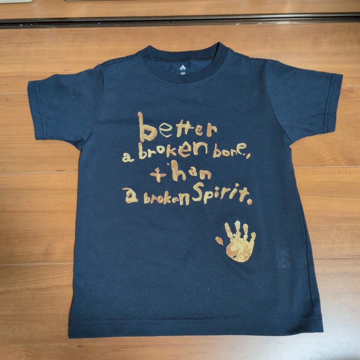 - デザイン: 「better a broken bone, than a broken spirit.」のメッセージと手形のプリント