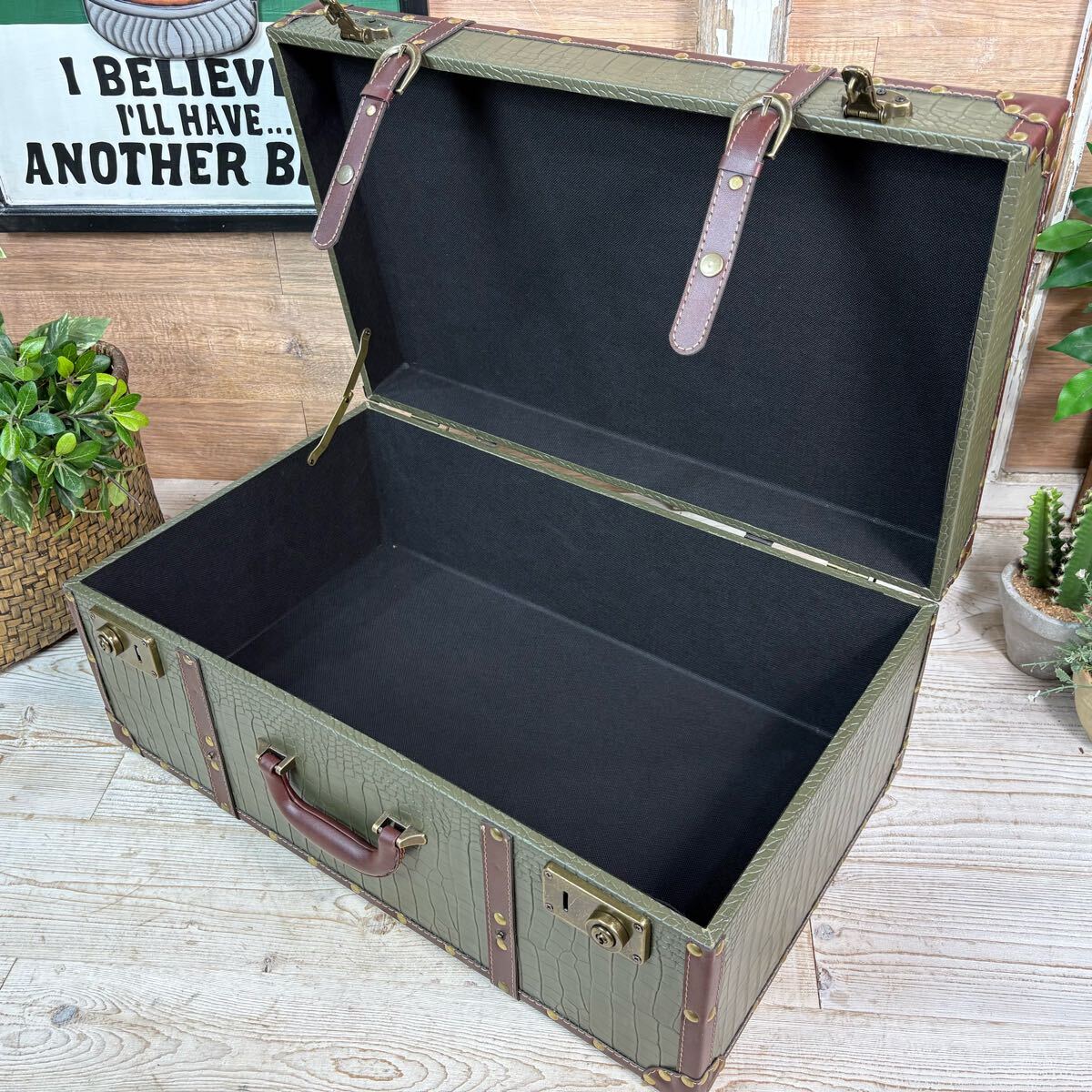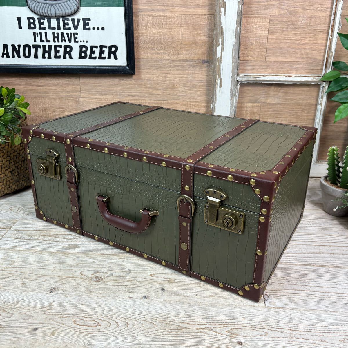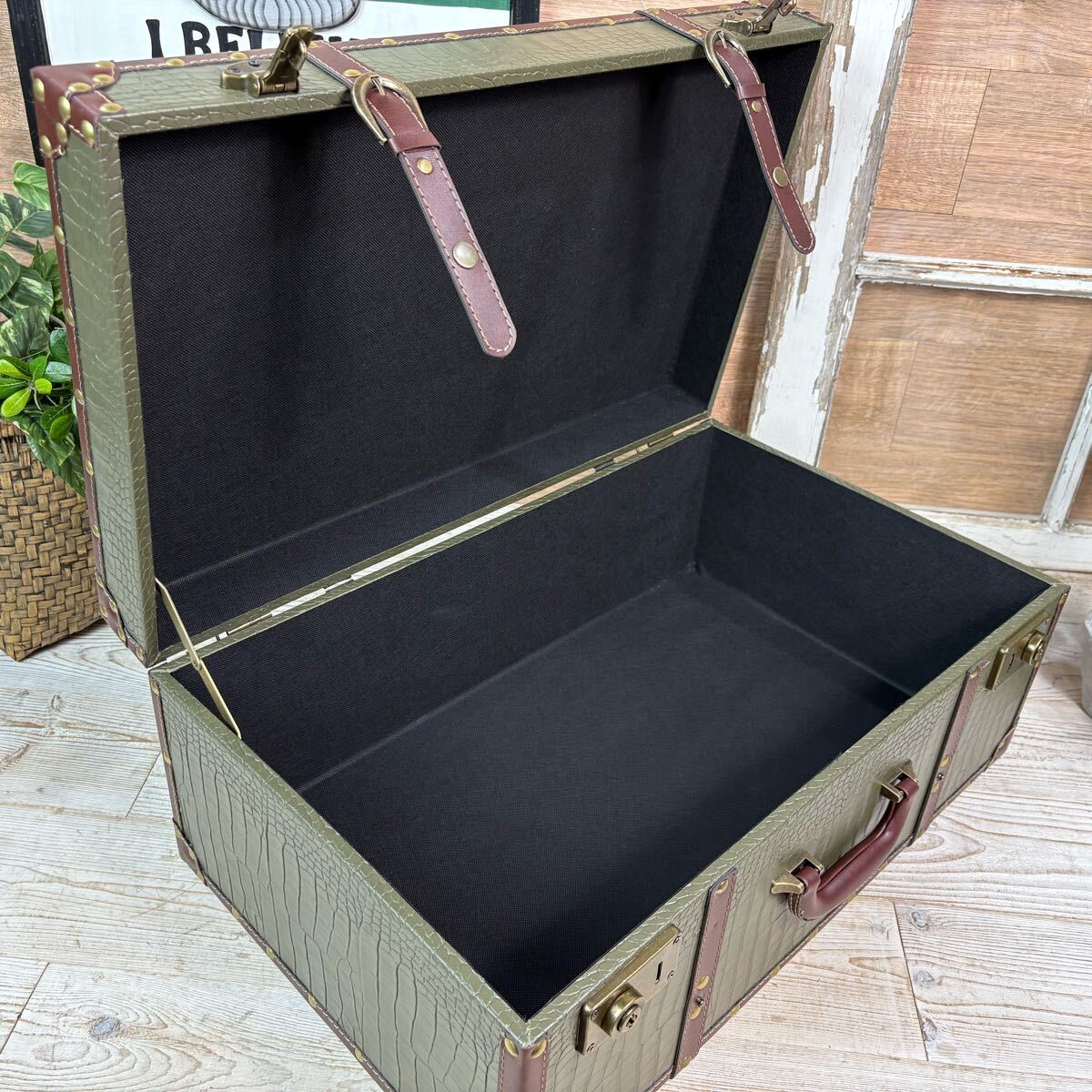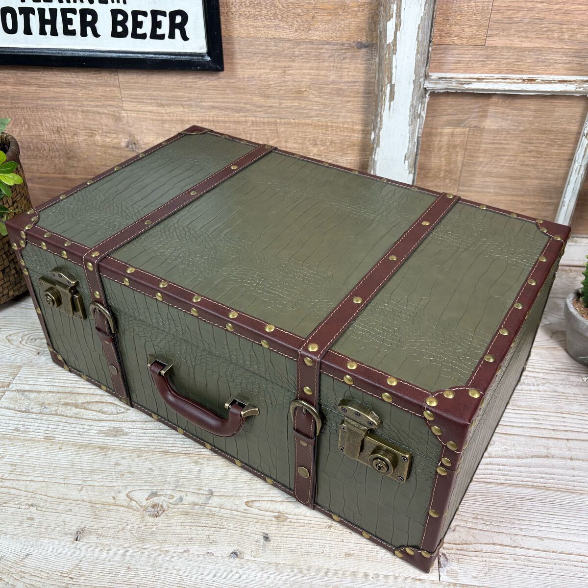 古びた雰囲気のヴィンテージ風特大トランク型小物入れになります。小物収納、机の整理整頓に一役かう商品ですよ。大人インテリアの雰囲気アップに役立ちそうですね。アンティーク、ヴィンテージの風合いもお楽しみいただけます。小物収納にはもちろん、ディスプレイ用やプランターにもアレンジできそうですね!多肉植物、エアープランツなどオススメです!ショップのディスプレイに最適です。そんなに重くないので持ち運びにも便利。しっかりとした作りですので書類ケースやトランクケースとしても使えそうです。