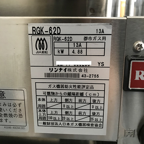 下火式焼物器 リンナイ(Rinnai) RGK-62D 都市ガス 業務用 中古/送料別途見積