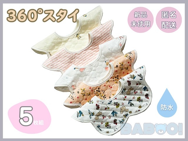 送料無料 よだれかけ ベビースタイ 防水回転 スタイ 360°スタイ 男女兼用 5枚組 防水仕様 吸水性 コットン 綿 出産祝い ギフト 丸型スタイ