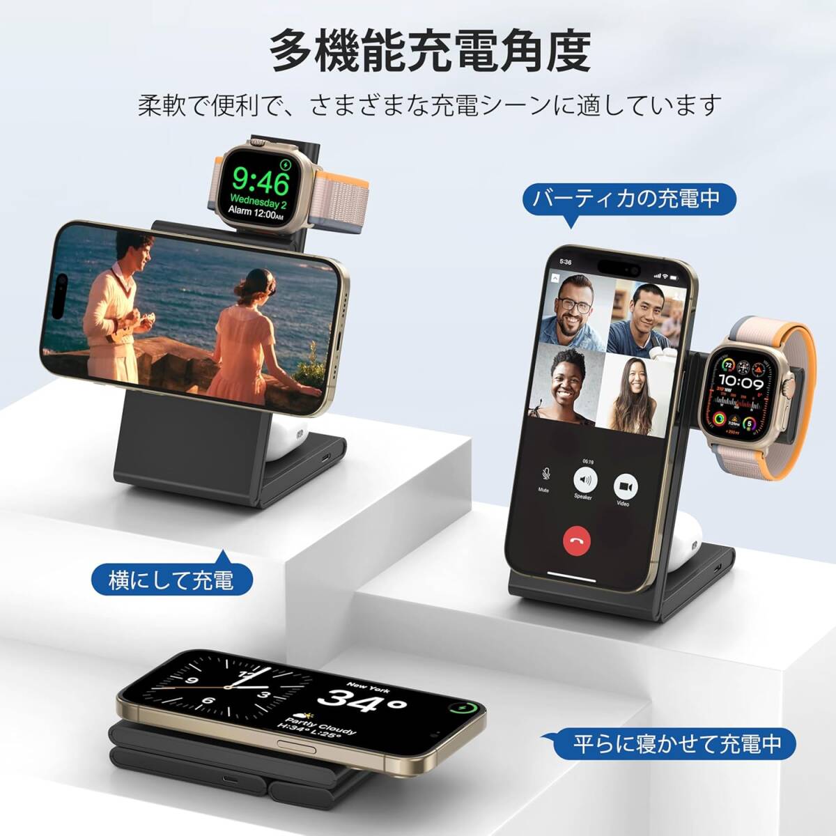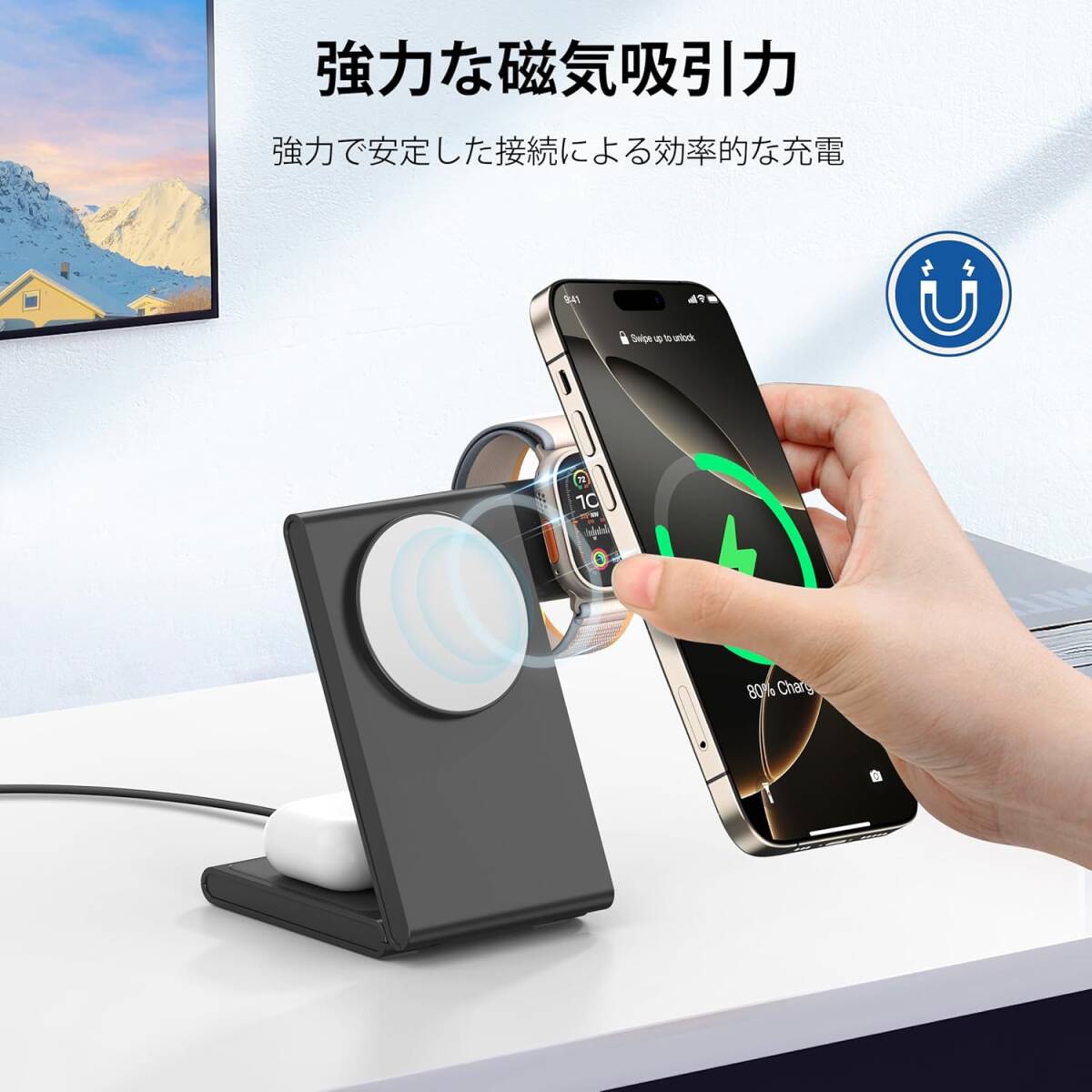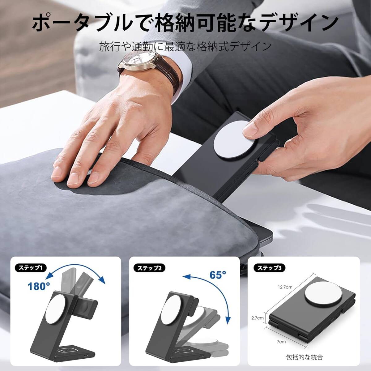 スタイリッシュ 3in1 Magsafe ワイヤレス充電器 折り畳み式 マグネット式充電 マグセーフ アップルウォッチ 充電器