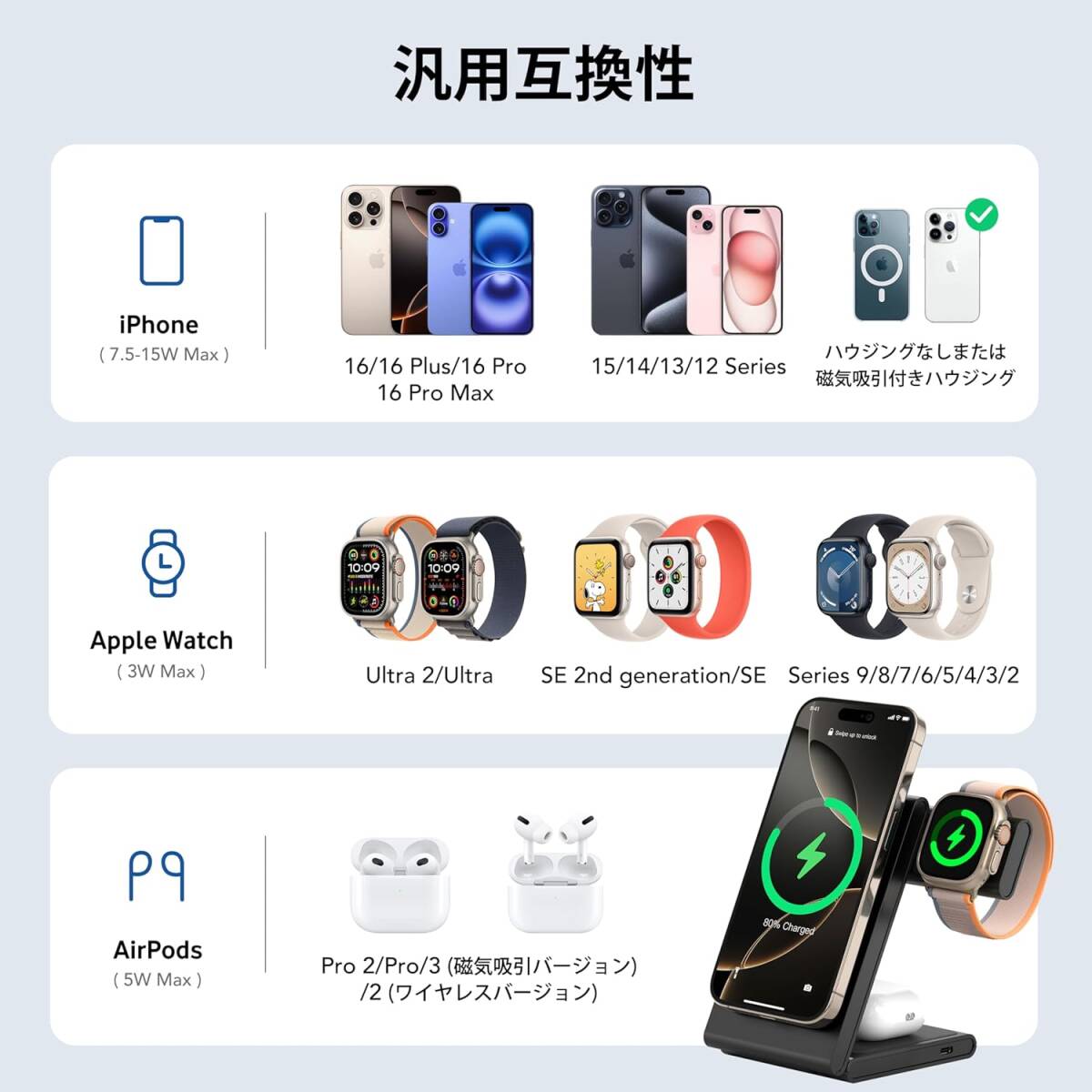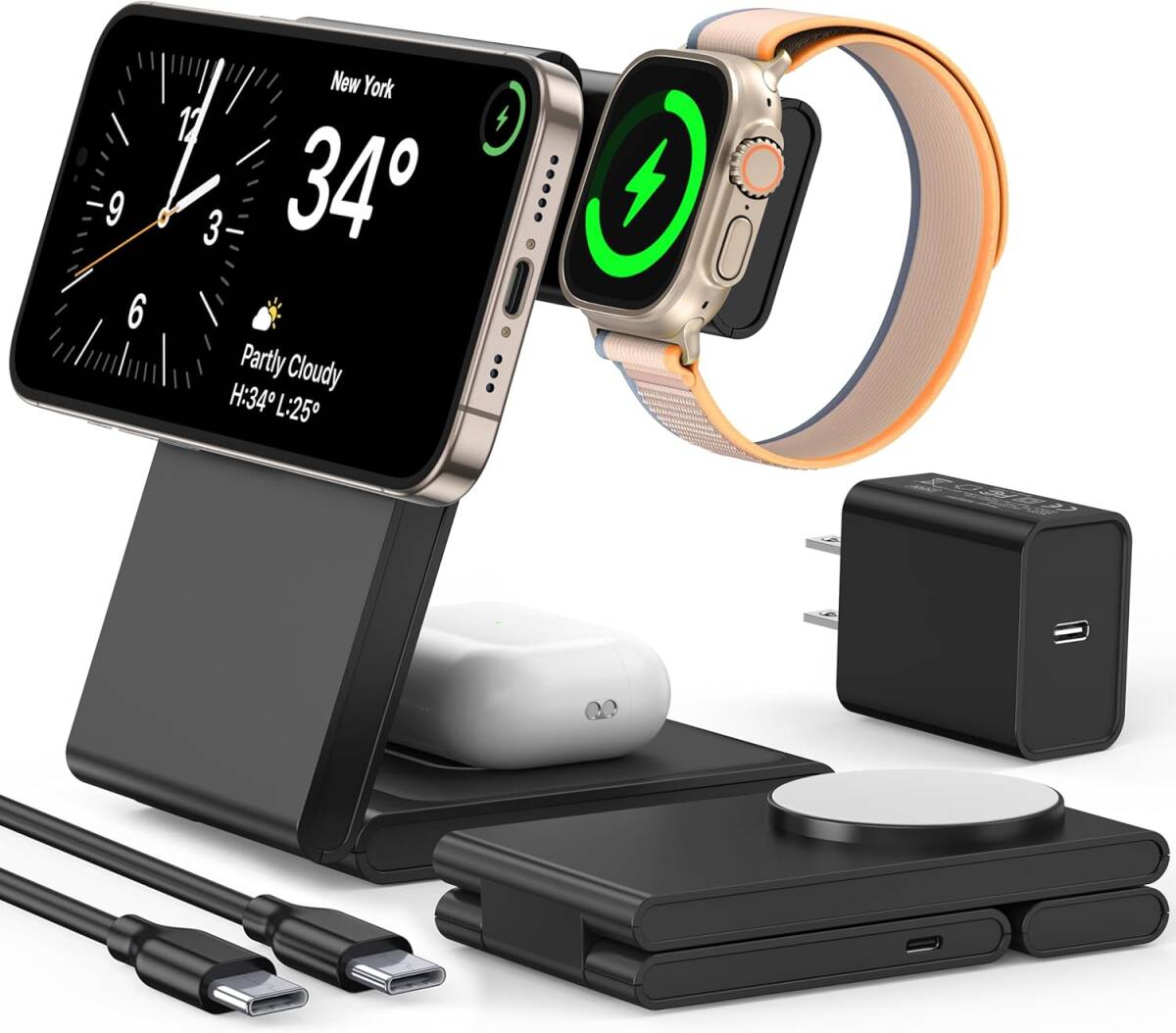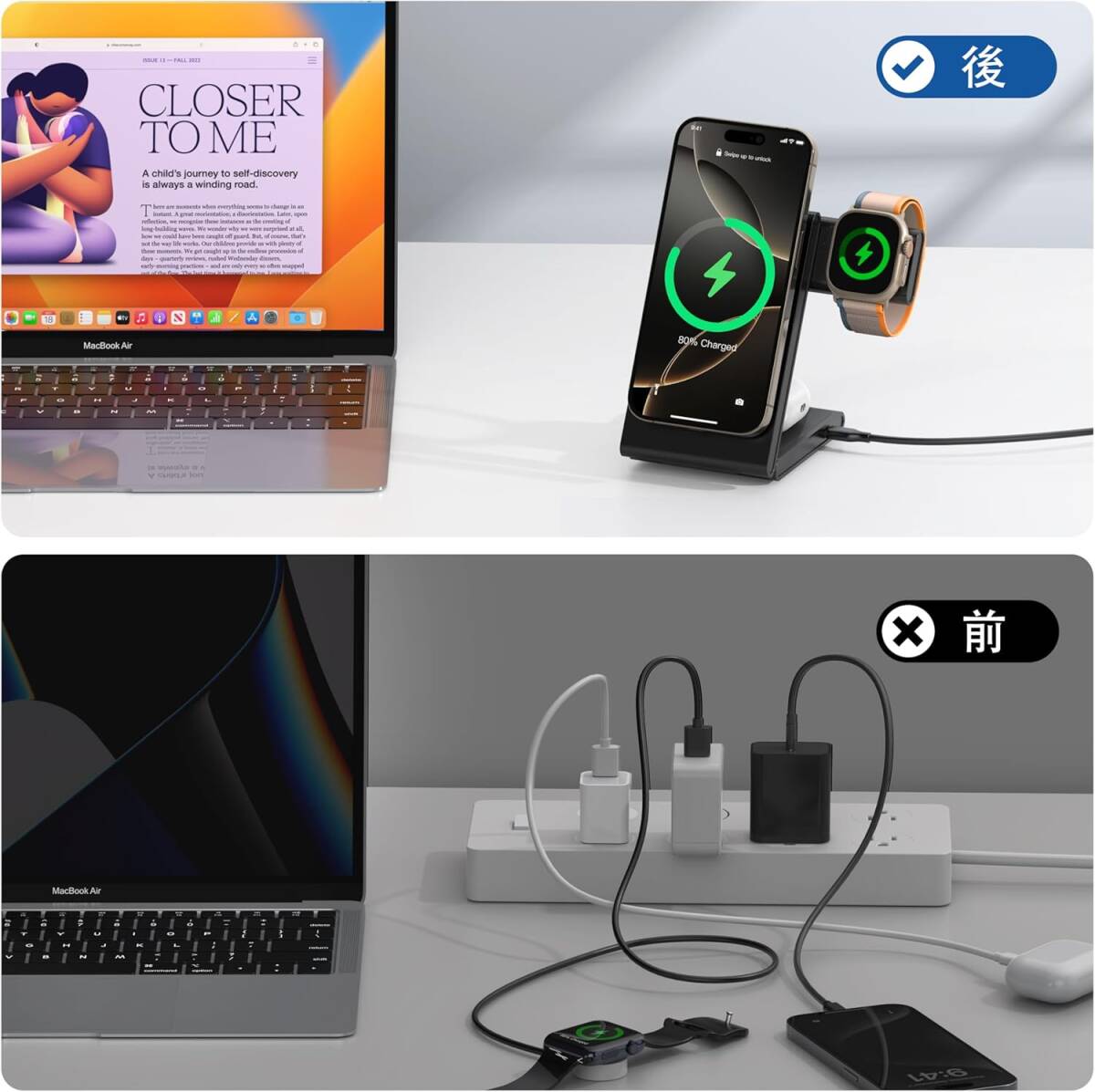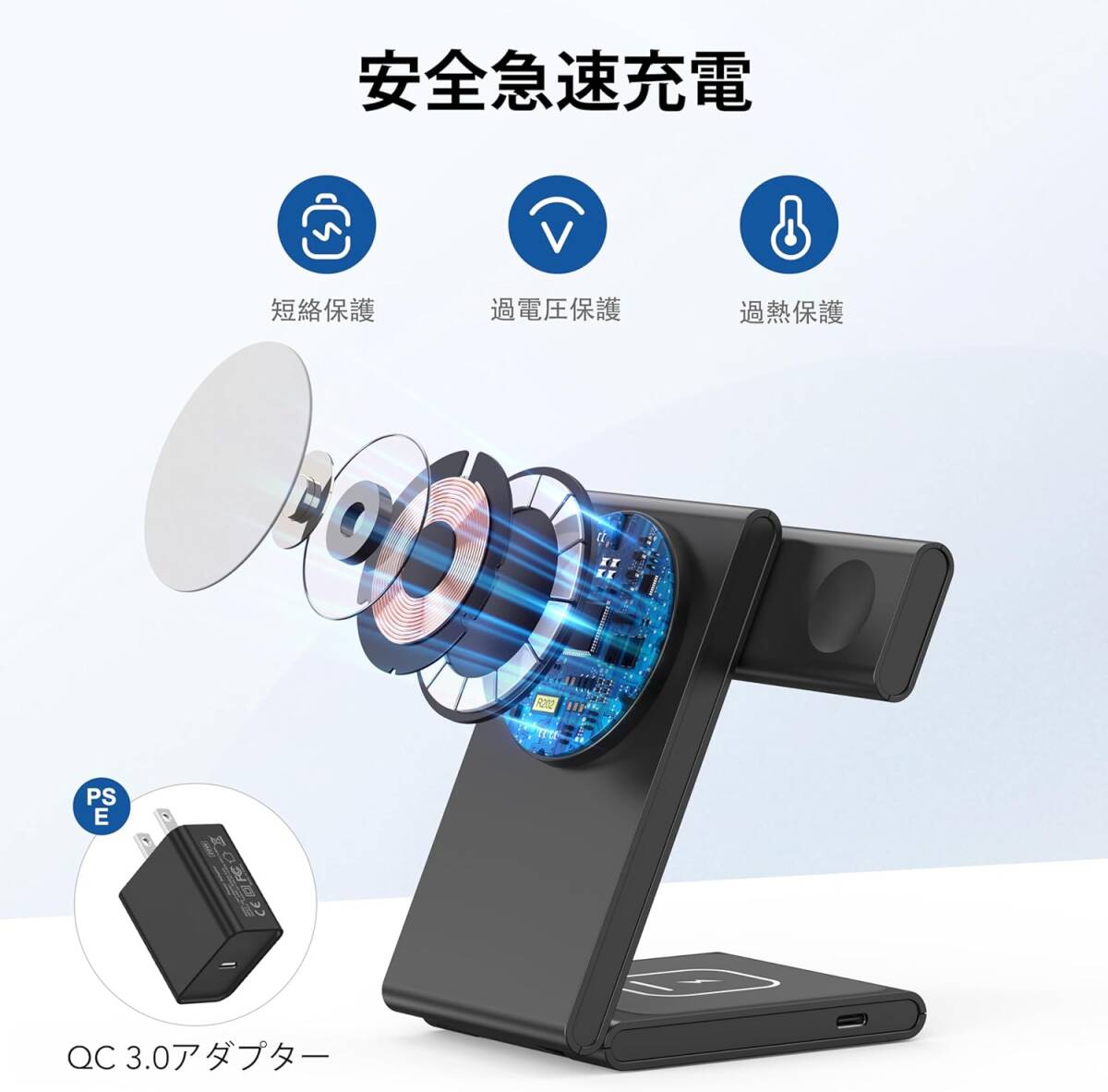 スタイリッシュ 3in1 Magsafe ワイヤレス充電器 折り畳み式 マグネット式充電 マグセーフ アップルウォッチ 充電器
