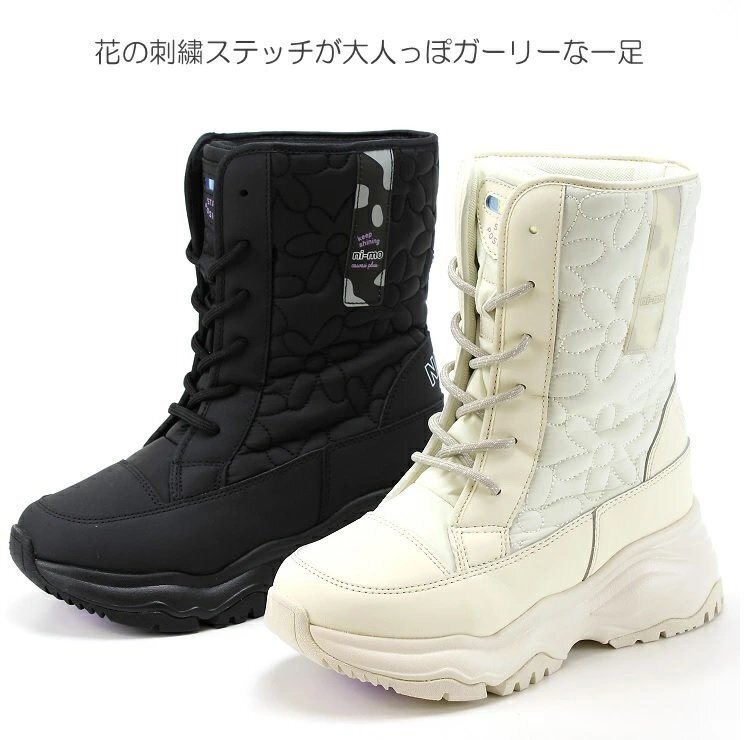 シンプルなレースアップのダウンブーツです。花の刺繍ステッチを大人っぽくデザインし、半透明部品にトレンドの柄がアクセント。