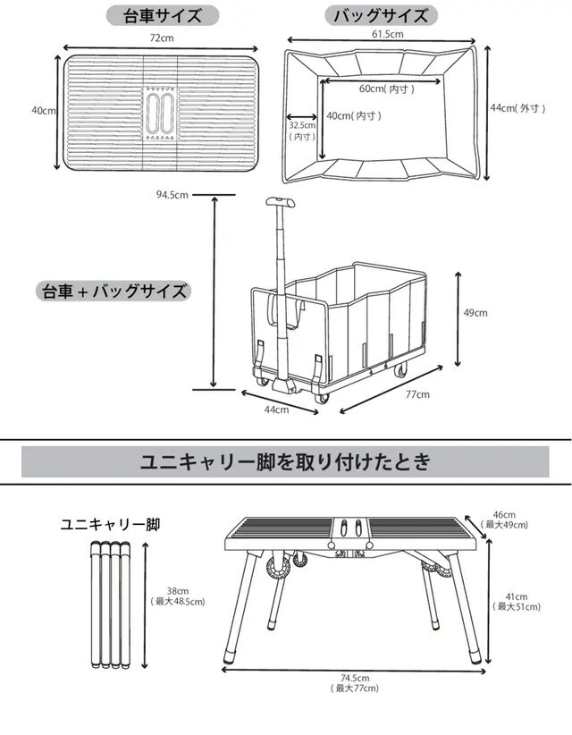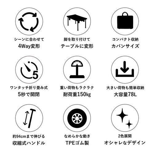 カバン、キャリーワゴンだけでなく台車・テーブルにもなります。