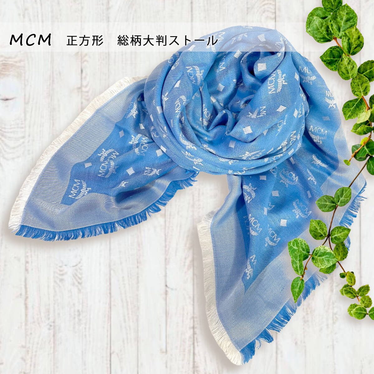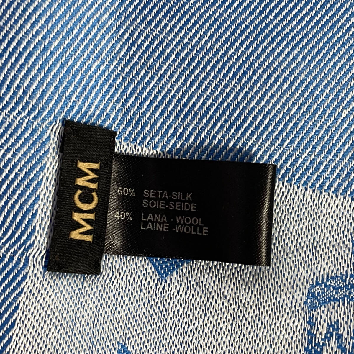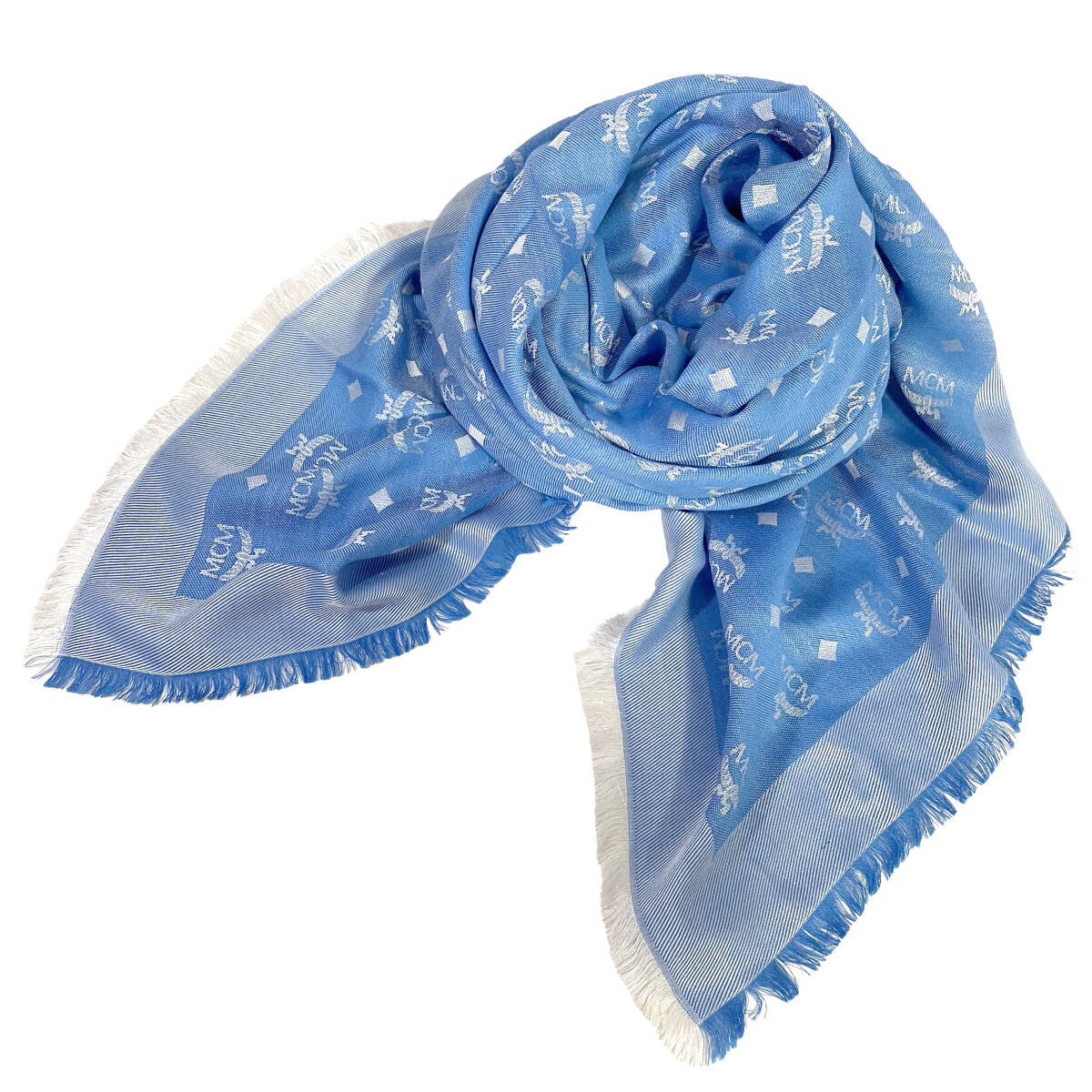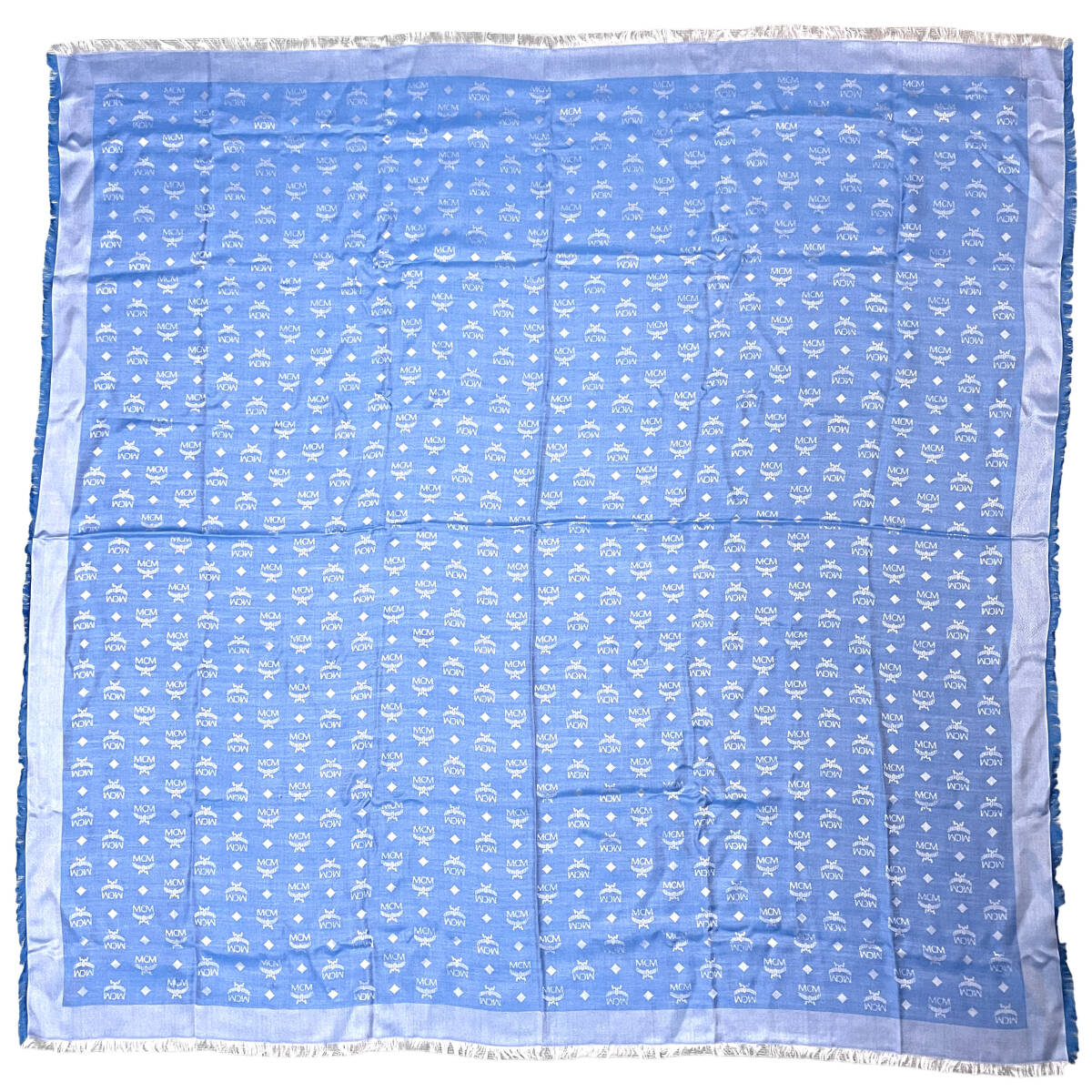 MCM大判ストールブルーロゴ総柄フリンジシルクウールマフラー正方形スクエアエムシーエムブランド鑑定済み本物青大きめスクエア四角高級感