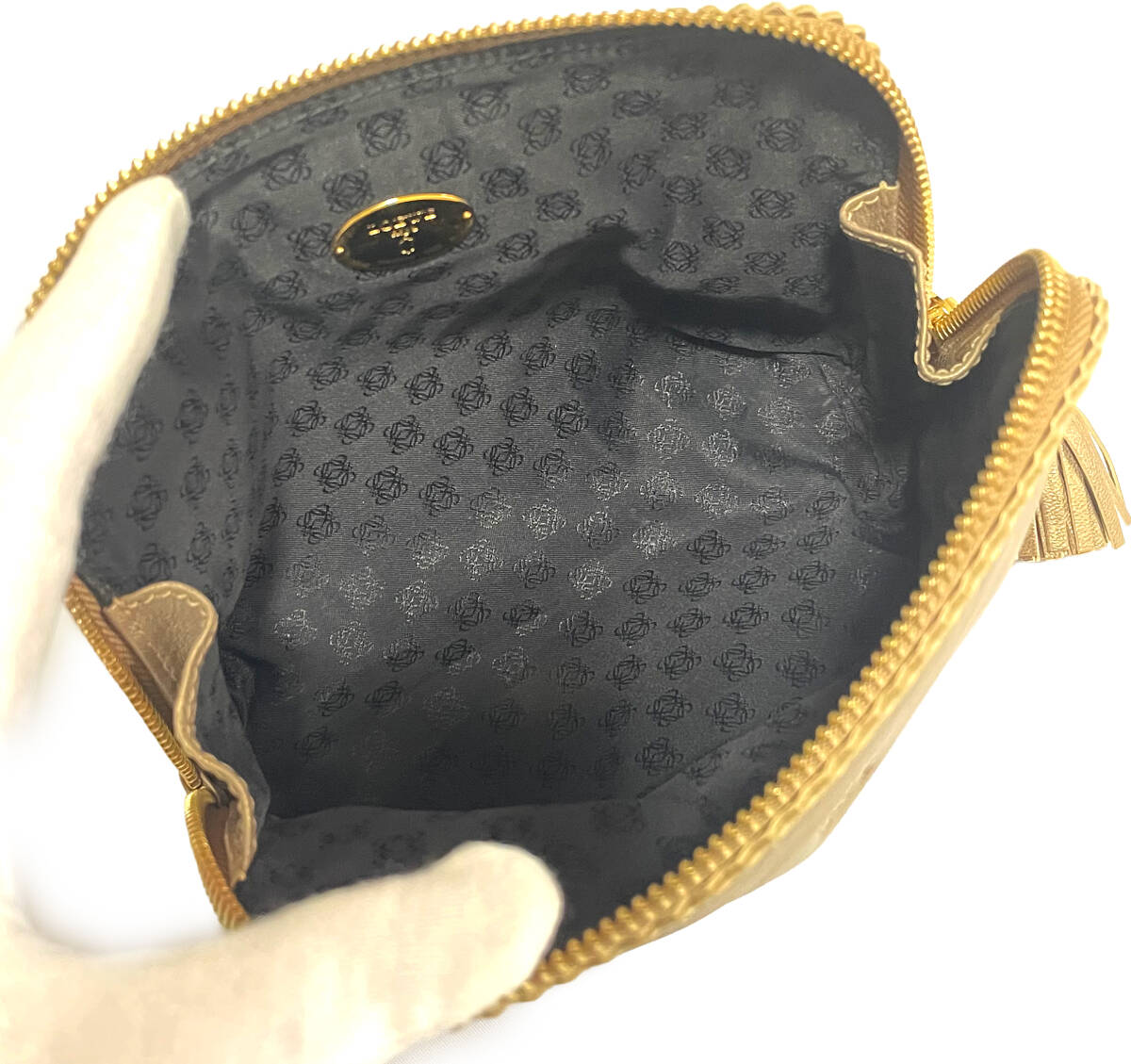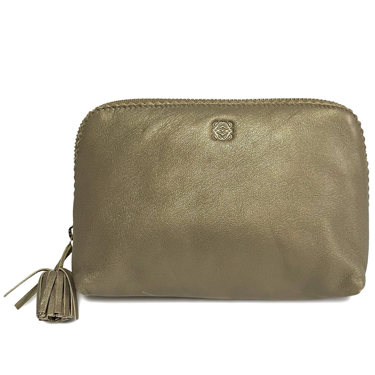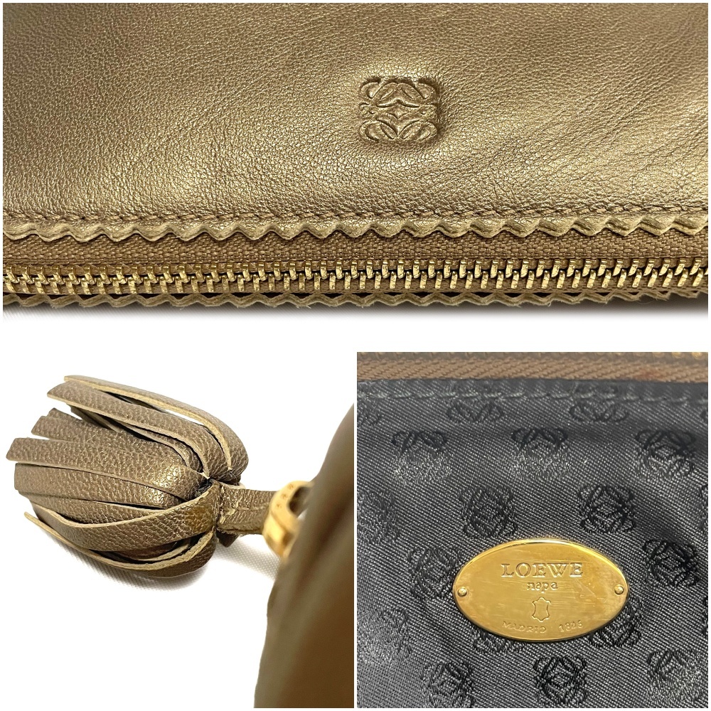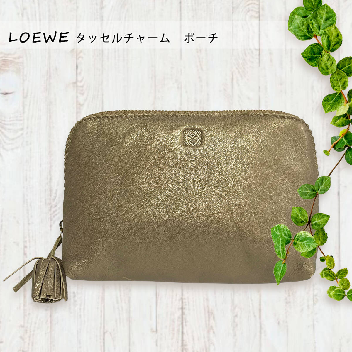 LOEWEタッセルチャームポーチベージュゴールドナッパレザーマチあり小物入れワンポイントロゴシンプルファスナー開閉ブランド鑑定済み