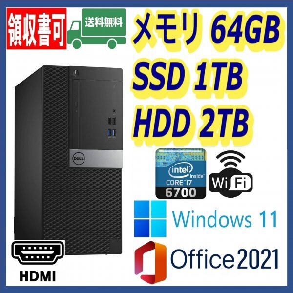 ■Dell OptiPlex 5050 MTです。 最強スペック、究極のPCです。 超高速CPUに大容量SSD(M.2 NVMe)、大容量HDD、超大容量メモリを搭載した最強スペックPCです。 ■超高速Intel Core i7-6700搭載 ターボブースト時、4.0GHzのコアが8スレッド駆動しますので、非常に高速です。 (省電力時は3.4GHz動作です。) ■超高速SSD(M.2 NVMe)1TB(1000GB)搭載 起動ドライブとしてM.2 NVMeを搭載していますので、通常のSSDよりさらに高速です。 ほとんど待つことなくすぐに起動します。 驚きの速さだと思います。 その他、起動に限らず、どのような作業も極めて高速です。 HDDとは別次元のスピードです。 大容量のため、全てのデータを高速なSSD(M.2 NVMe)に置いて使えますので、何をするにも高速です。 ■大容量HDD2TB(2000GB)搭載 データ保存用として大容量で、動画等の大きなデータも多数保存できます。 ■メモリ(DDR4)増設して超大容量64GB搭載 超大容量で、どんな作業も余裕でこなせます。 DDR3より高速なDDR4規格ですので、より高速です。 転送速度が2倍になるデュアルチャネル(Dual Channel)構成なので、高速動作します。 ■USB3.1 Gen 1搭載(正面2箇所、背面4箇所) USB3.1 Gen 1 (USB3.0)は、これまでのUSB2.0と互換性を保ちながら、データの転送速度が最大5Gbpsとなり、USB2.0(最大480Mbps)の10倍以上になりました。 従来の機器もそのまま使え、USB3.1 Gen 1 (USB3.0)対応機器同士で接続すればさらに快適になります。 ※USB2.0も正面2箇所、背面2箇所あります。 ※USB3.1 Gen 1 (USB3.0)端子には、SSという文字が刻印されています。SSは、Super Speedの略でUSB3.1 Gen 1 (USB3.0)の規格名です。 ■DVDマルチドライブ搭載 DVDの視聴やCDの再生ができます。 ※ブルーレイ対応のPCをご希望の方々のため、ブルーレイドライブ(オプション)も用意しています。 ■ギガビットLAN対応 通信速度を1Gbpsの高速通信に対応しています。 ※光ファイバー環境でも余裕で高速対応できます。通常の回線でもバッチリ使用できます。 ■無線LAN(Wi-Fi)対応 インターネットや周辺機器など高速な無線通信ができるようになっており、幅広い環境で使用可能です。 ■フルHD表示対応 グラフィックスは、インテルHDグラフィックス530搭載です。 高解像度で、大画面TVやモニターなどフルHD表示に対応し、動画再生なども高画質で楽しめます。 ■マルチモニター対応 D-subミニ15ピン(VGA)端子、HDMI端子、DisplayPort端子(2出力)に2台のモニターをつないで、両画面に同時に表示できます。 ※オプションの変換アダプターを使えば、DisplayPortをD-subミニ15ピン(VGA)、DVI、HDMIに変換することもできます。 ■Windows 11 Pro 64bit (日本語版)搭載 最新のWindows 11を搭載・認証してあります。 面倒な修正プログラムなどすべて最新の状態になっており、商品到着次第すぐに使用できます。 ■DtoD領域あり リカバリディスクなどなしでいつでも到着時の状態にリカバリできます。 また、リカバリディスクをご自身で作成して、それを使ってリカバリすることもできます(そのためのツールが入っています)。 ■Microsoft Office 2021 (日本語版)搭載 Microsoft Office 2021をインストール・認証してあります。 Word、Excel、PowerPoint、Access、Outlook、OneNote、Publisherがプリインストールされており、即使用可能です。 ※Office 2021は、Office 2019の基本機能をそのままに新しい機能を追加した最新Officeです。 ※Office 2021のExcel、Word、PowerPointでは、「自動保存」、「画像やアイコンなどの挿入」、「OpenDocument(ODF)1.3」などが追加されています。 ※下位互換性を保っていますので、Office 2019やOffice 2016のファイルなどは今まで通り扱えます。 ※最新Office 2021は「Windows 11 対応版」です。将来的に考えても安心です。 ※永続ライセンス版(使用期限:永久無期限)です。 ■便利なソフト搭載 ①セキュリティ Microsoft Windows Defenderを搭載しています。 安心のMicrosoft社製セキュリティ・ウイルス対策ソフトウェアです。 追加料金不要で使い続けられます。 ※ウイルスパターンファイルは自動更新され、常に最新の脅威から保護されます。 ※出品前にすべてのファイルをスキャンし、安全であることを確認済みです。 ②ブルーレイビデオ、DVDビデオ、動画再生 一般的な市販のブルーレイビデオ、DVDビデオ、動画、CD、メディアファイルなどのコンテンツの再生ができます。 面倒な設定がなく、再生が可能です。 ③DVD、CD作成 DVD、CDが作成できるソフトが入っています。 大切なデータに暗号保護をかけてディスクへ記録が可能です。 ④動画編集 動画、写真を組み合わせてムービーを作成が可能なソフトが入っています。 ⑤メール 最新のMicrosoftメールソフトがインストールされています。 ■電源ケーブルをご希望の場合は、落札後メッセージにてお知らせください。 ■清掃済みですが、中古につき、落ちない汚れやキズはある程度あります。画像は流用です。 ■フルHD表示(1920x1080)用に設定してありますので、もしそれよりも低い解像度のモニターでお使いの場合、落札時にお申し出ください。 そのモニター用に解像度を設定します