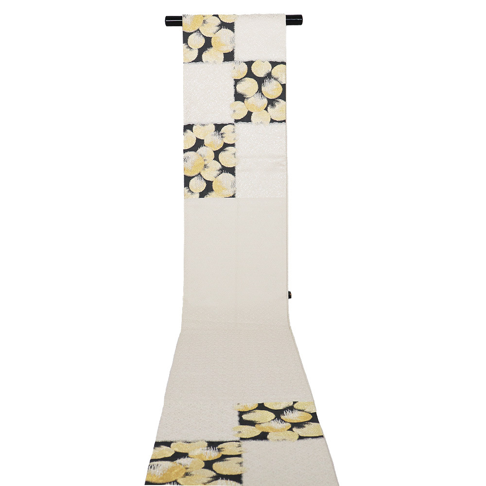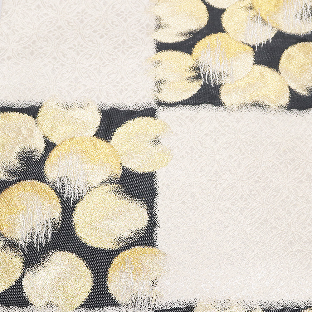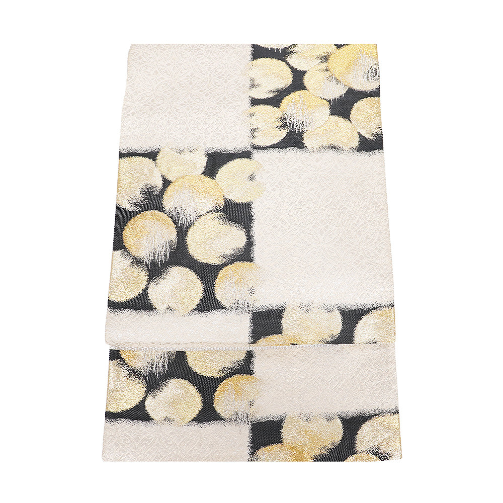 | 商品 | 西陣織袋帯 ベージュ・墨黒・七宝文地模様 格子縞地 金・銀・満月・霞 仕立て上がり |