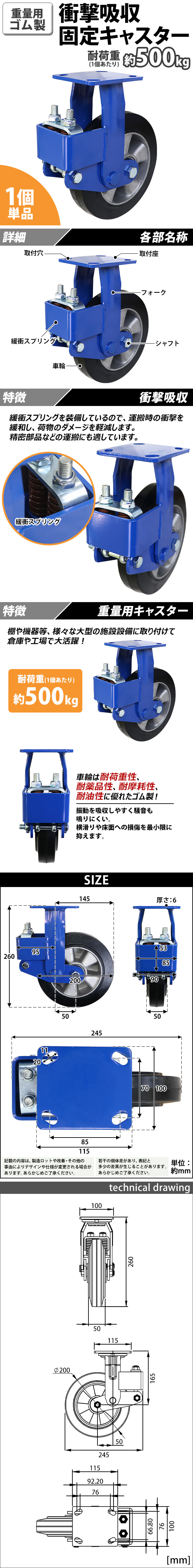 | 商品名 | 送料無料 緩衝キャスター 固定キャスター 重量用 ゴム製 1個 単品 衝撃吸収キャスター 重量用キャスター 耐荷重約500kg(1個あたり) 車輪直径約200mm 幅約50mm 衝撃緩和 軽減 固定車 緩衝スプリング バネ ゴムキャスター ゴム車輪 工場 倉庫 作業 運搬 sacsh80r01ru1p |
