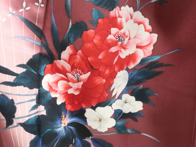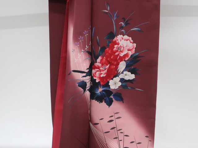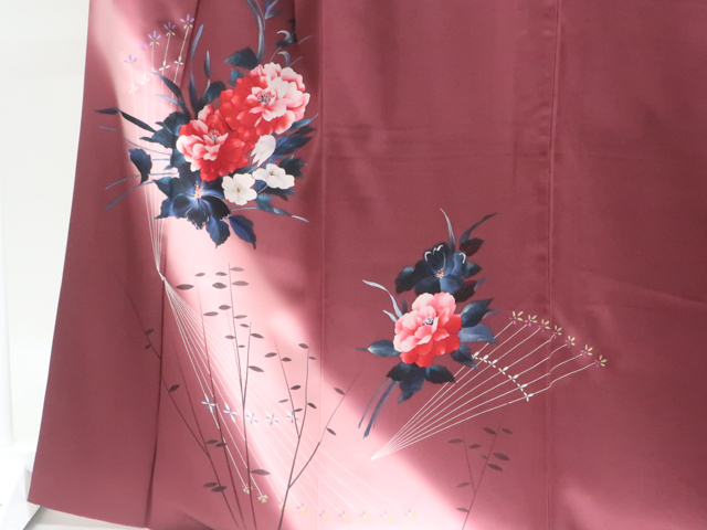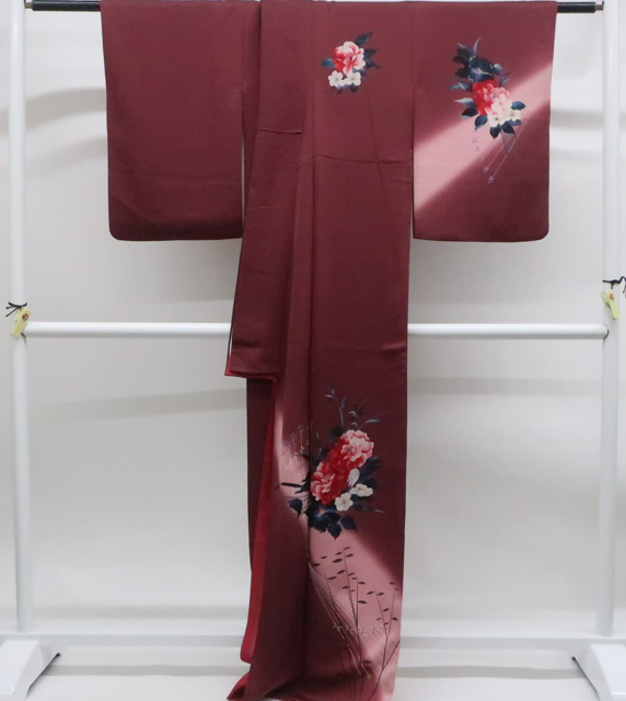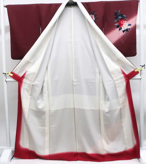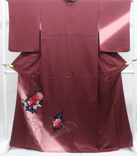 リサイクル商品のため、後身頃、背、衿折れ山に薄汚れ、衿裏や胴裏にシミがございますが着用可能なお品です。 地色は赤紫です。 1枚目の画像が近いお色かと思われます。 素材は正絹です。 |