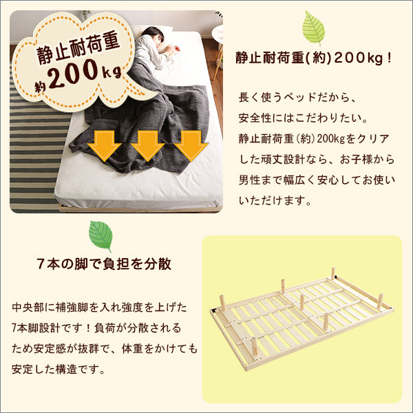 【ポイント】 お好みに合わせて3段階に高さを調節できる脚付きです。 北欧産パインフレームを使用した、通気性と耐久性に優れた頑丈設計です。 やさしい無垢材のナチュラル、爽やかなホワイトアッシュ、シックなブラウンの3色がございます。 低ホルムアルデヒド仕様で、F★★★★(フォースター)獲得!お子様にも安心です。 |
