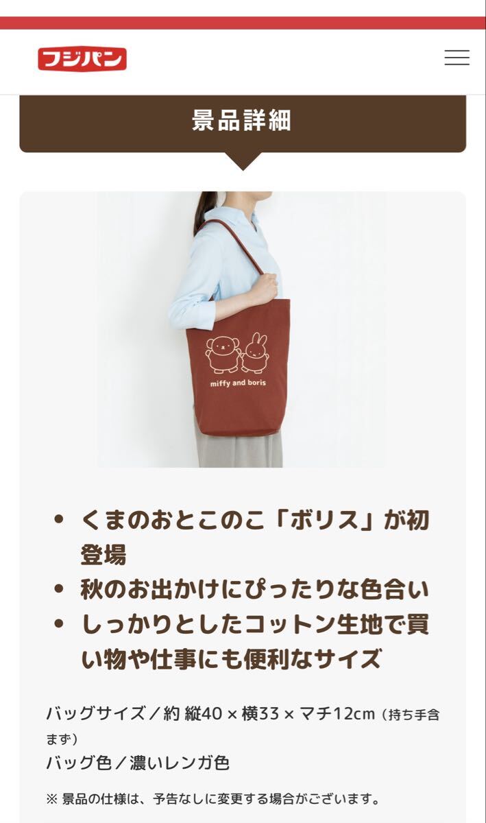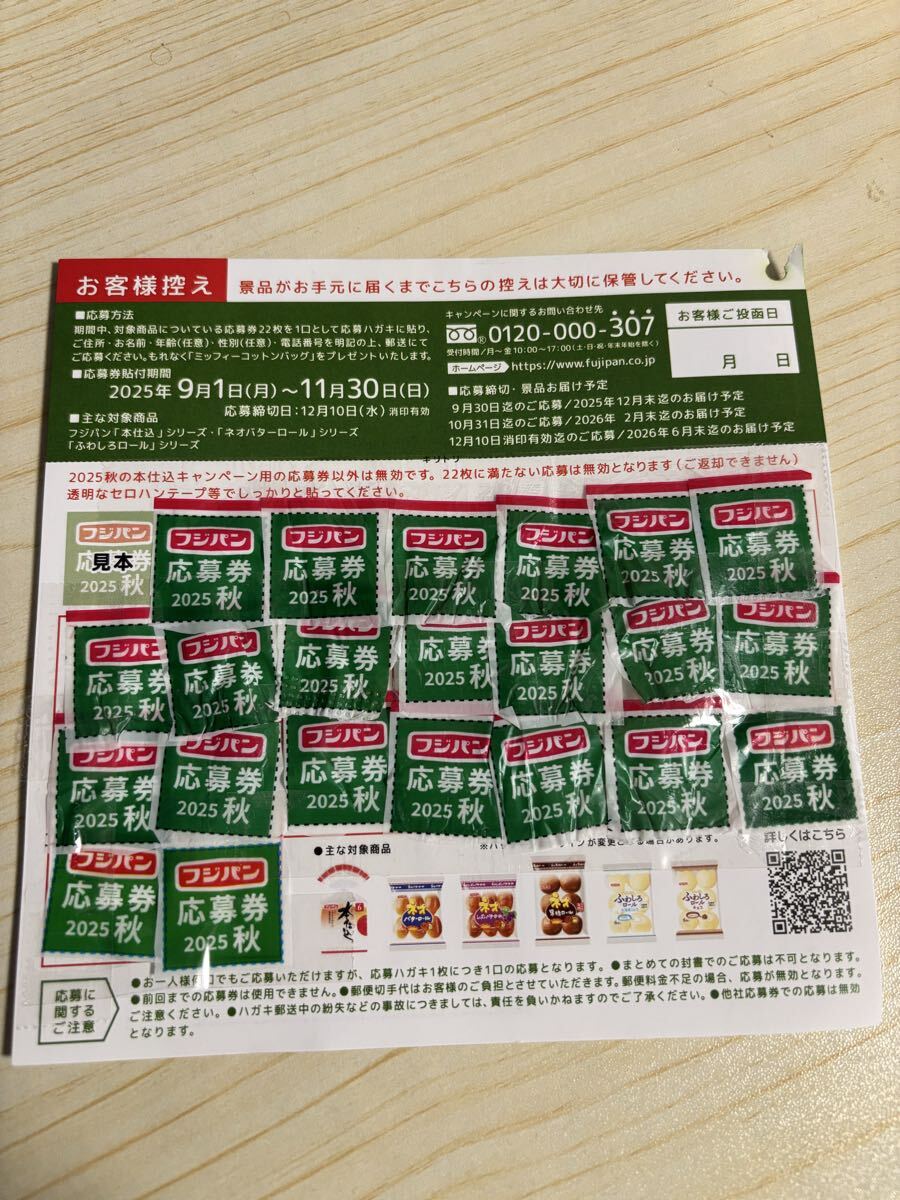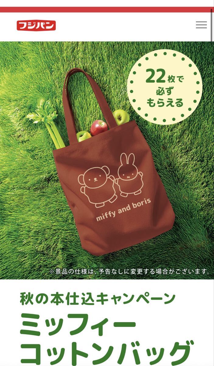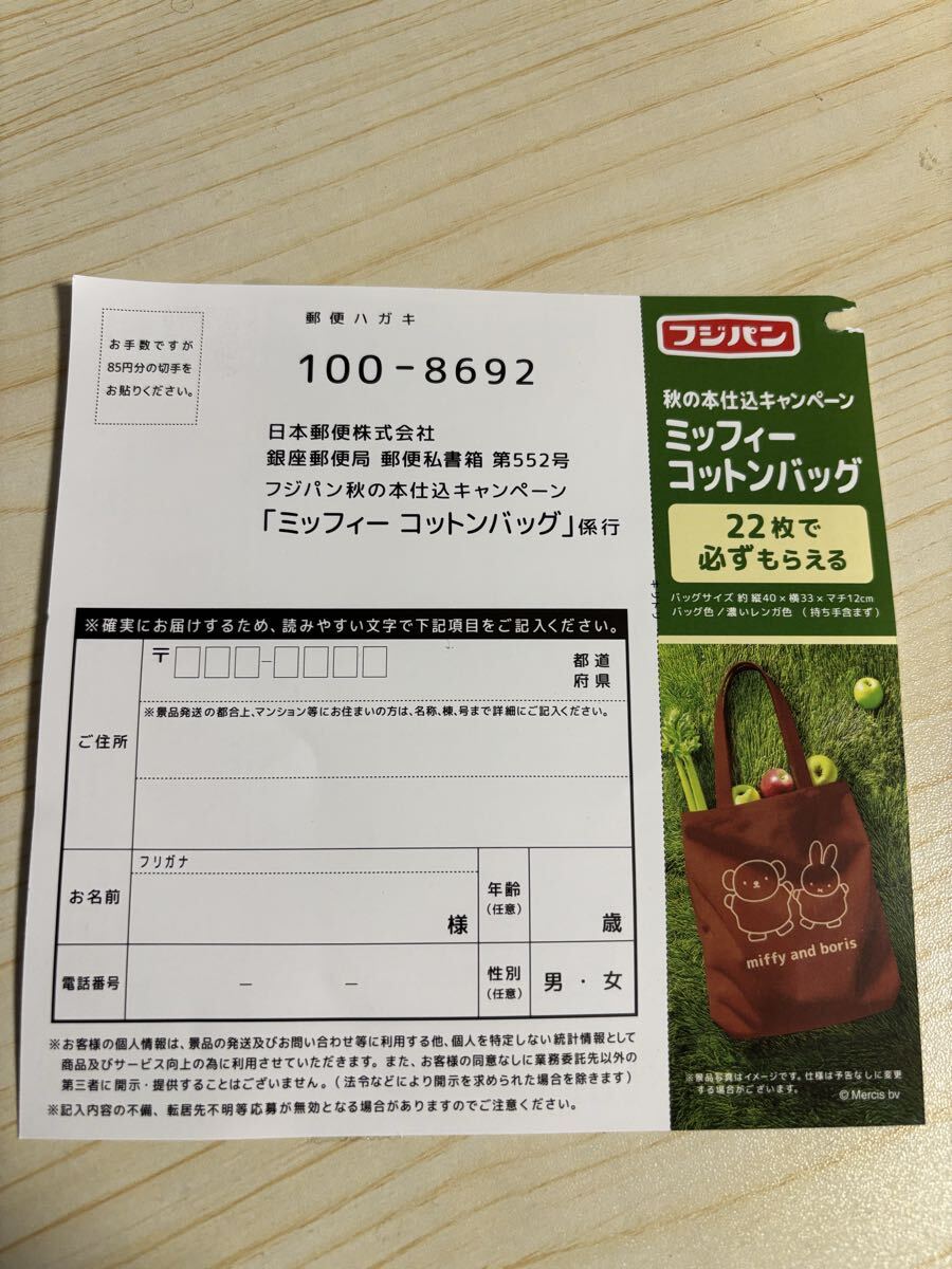 フジパン 秋の本仕込キャンペーン2025秋、ミッフィーコットンバッグ 応募券22枚分です。 専用の応募ハガキに貼り付けしておりますので、送り先を記載して切手を貼って送ると後日トートバッグがお届けとなります。12/10(水)が応募締切日となりますので、トートバッグが欲しい方は、ぜひご検討よろしくお願いします。ノンクレーム・ノンリターンで入札をよろしくお願いします。
