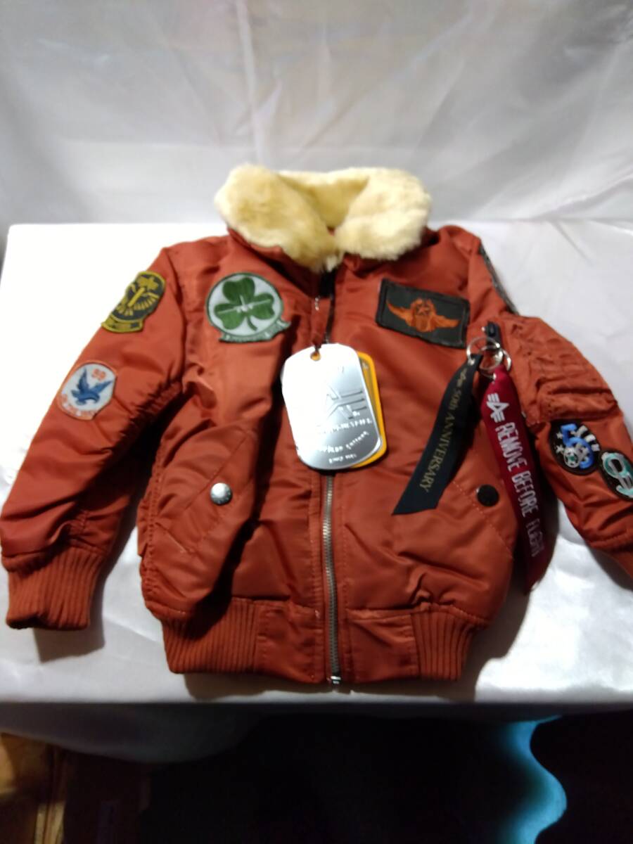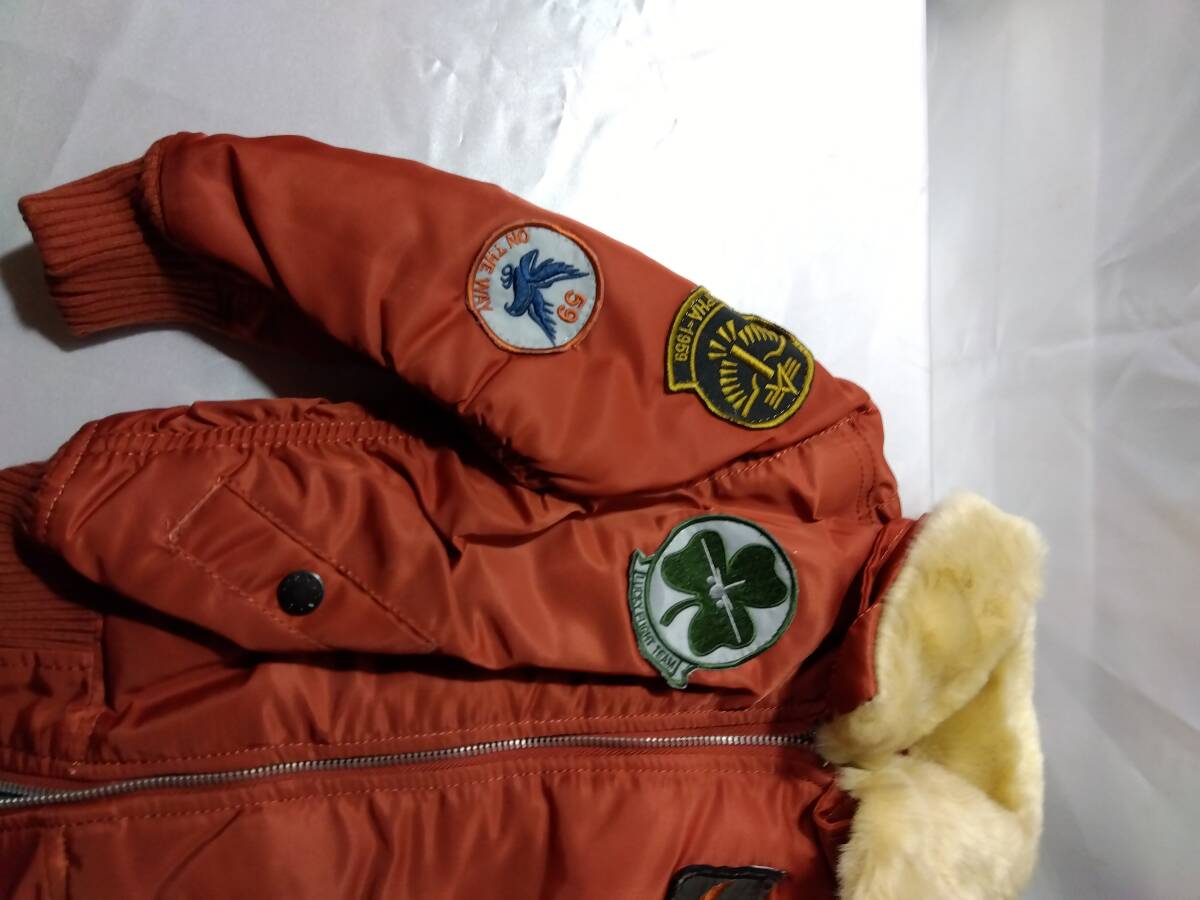 アルファマーベリックフライトジャケットキッズ ナイロン 襟ボア脱着式 中綿入 ワッペン6個 着丈48cm肩幅36cm胸囲37cm袖丈37cm平置き採寸