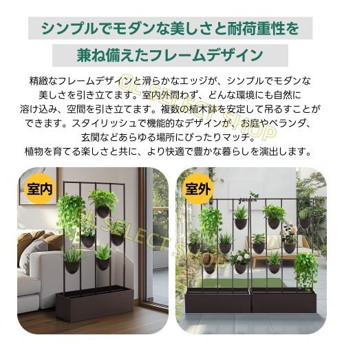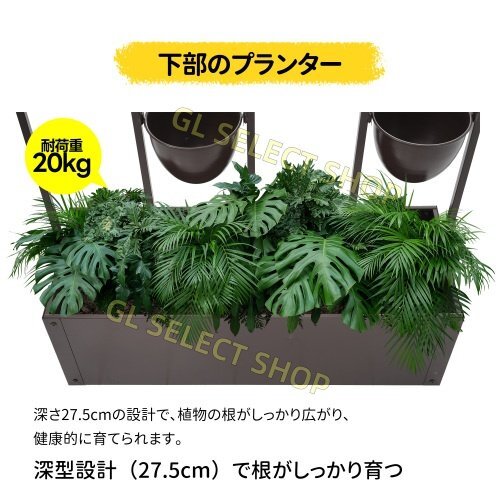 • ◎03 しっかりと取り付けられた植木鉢で安定性抜群上部には6つの植木鉢を備え、それぞれフレームにしっかりと取り付けられているため、重量が均等に分散され、植物が偏って成長しても倒れにくく、優れた安定性を実現します。強風でも落下の心配はありません。巧妙なはめ込み構造デザイン植木鉢を簡単に取り外せる設計で、清掃も非常に簡単です。植木鉢のサイズ 直径19cm 高さ15cm 植木鉢の耐荷重5KG 下部のプランター深型設計(27.5cm)で根がしっかり育つ深さ27.5cmの設計で、植物の根がしっかり広がり、健康的に育てられます。プランターの内寸:88*38*27.5cm耐荷重:20kg