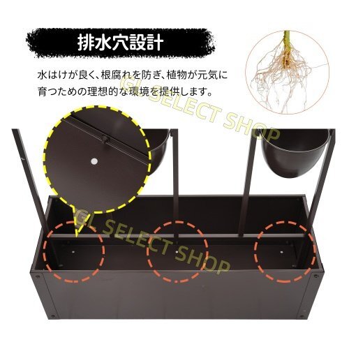 • ◎04 鉢植えやガーデニングツールなどを収納でき、使い勝手も抜群です。排水穴設計:水はけが良く、根腐れを防ぎ、植物が元気に育つための理想的な環境を提供します。電着塗装:電着塗装による防錆加工が施されており、錆びにくく、屋外でも安心してご使用いただけます。取り付けは簡単、10分で完了!プランターボックスは一体型デザインで、棚に置くだけで簡単にご使用いただけます。