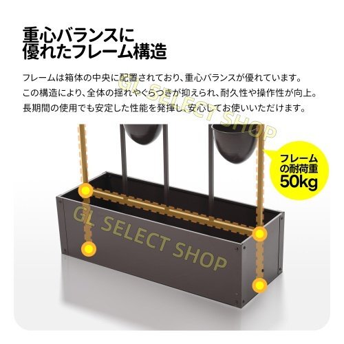 • ◎02重心バランスに優れたフレーム構造フレームは箱体の中央に配置されており、重心バランスが優れています。この構造により、全体の揺れやぐらつきが抑えられ、耐久性や操作性が向上。長期間の使用でも安定した性能を発揮し、安心してお使いいただけます。フレーム耐荷重50KG