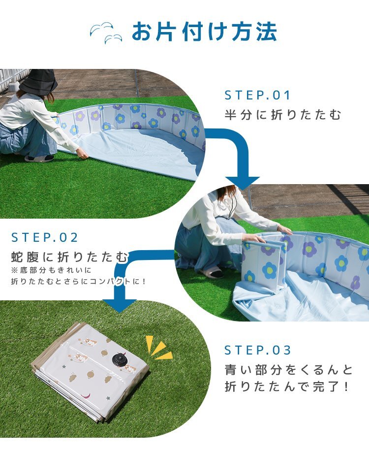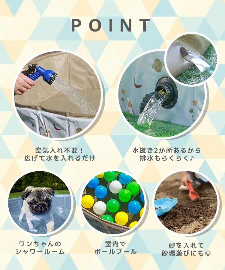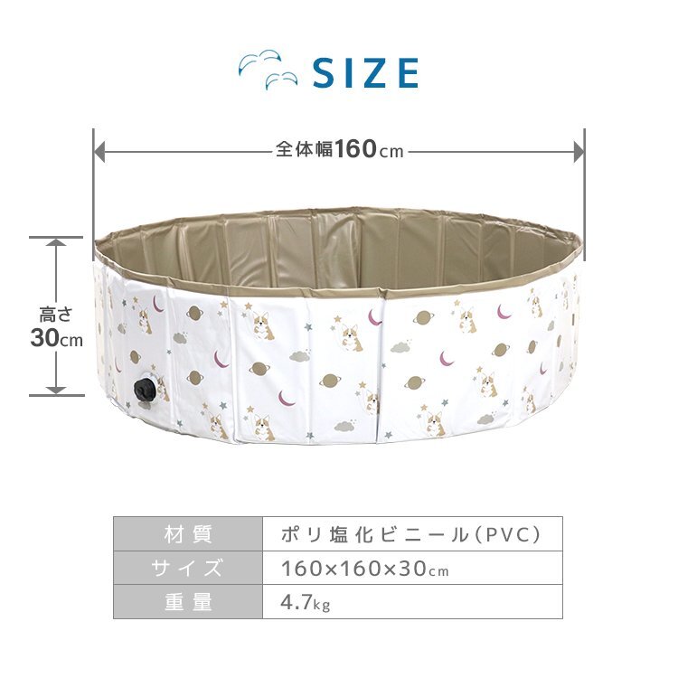 \ 面倒な空気入れ不要♪ / 簡単設置、簡単片付けでマルチに使える折りたたみプール! 空気入れ作業不要!パタパタ開いて水を入れたらすぐに遊べます。 滑りにくく、やぶれにくい仕様となっているため、お子様も安心してお使いいただけます。 排水口が2か所ついており素早く排水できます! 一人でも簡単に畳めて、片付けもラクラク♪ ワンチャンの水遊びやお風呂としての使用の他、子供用のプールや砂場、室内ではボール遊びにもオススメ! コンパクトなので収納や持ち運びにも便利です。 ※カラーボールは別売りです ■商品コード:GAC006DG ■商品仕様 カラー:コーギーブラウン サイズ:(約)160cm×160cm×30cm 重量:(約)4.7kg 素材:ポリ塩化ビニール(PVC) ■注意事項 ・使い始めは、素材特有の匂いがする場合があります。一日程度、風通しの良い場所に広げておくと解消されます。 ・製造過程の為、多少の折り目、製造時の汚れ、シミ、シワ、色落ち、若干の接着剤残りなどある場合がございます。 不良ではありません。これらを理由とする不良返品、不良交換はお受け致しかねます。予めご了承下さい。 ・必ず保護者同伴のもと、本商品をご利用下さい。 ・本品は水深が深くなるため、対象年齢未満のお子様は使用しないで下さい。 ・プールを置く付近に破損の原因となるトゲやガラス片、金属片、木片、砂利などがないか、ご確認下さい。 ・タバコや火気には近づけないで下さい。 ・プールは安定した平らな場所でご使用下さい。 傾斜のある場所、タイル・煉瓦など目地や段差のある場所でのご使用は変形・破損の原因になりますので避けて下さい。 ・表面に塗装、コーティング等の処理された場所でのご使用は塗装等が変色したりプール本体に色移りすることがあります。ご注意下さい。 ・商品は、モニターによって色合いが異なって見える場合があります。 ・仕様・デザインは改良のため予告なく変更することがあります。 ■保障期間 7日間 ※商品到着後7日以内の初期不良・破損のみご対応させていただきます。 【新品未使用品です】 |