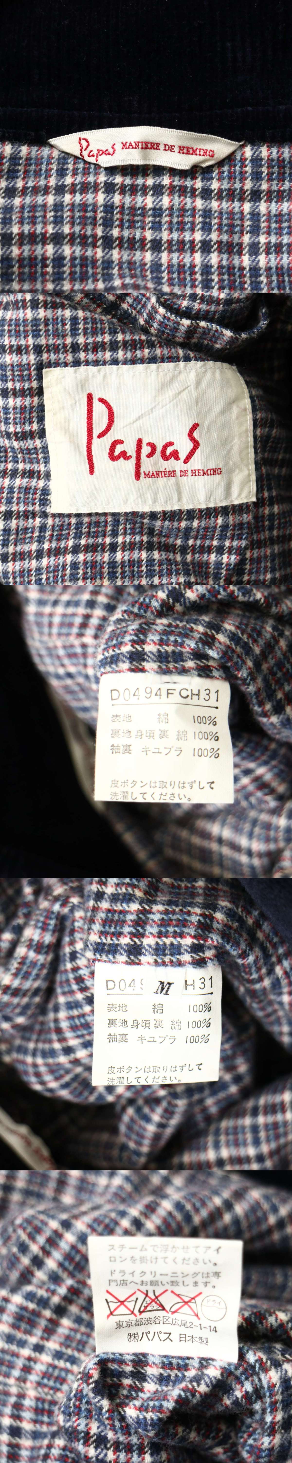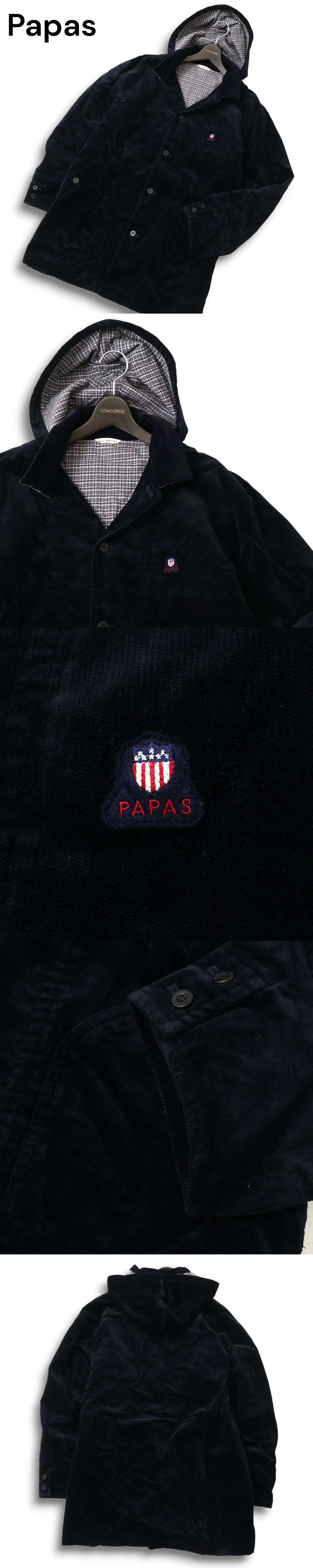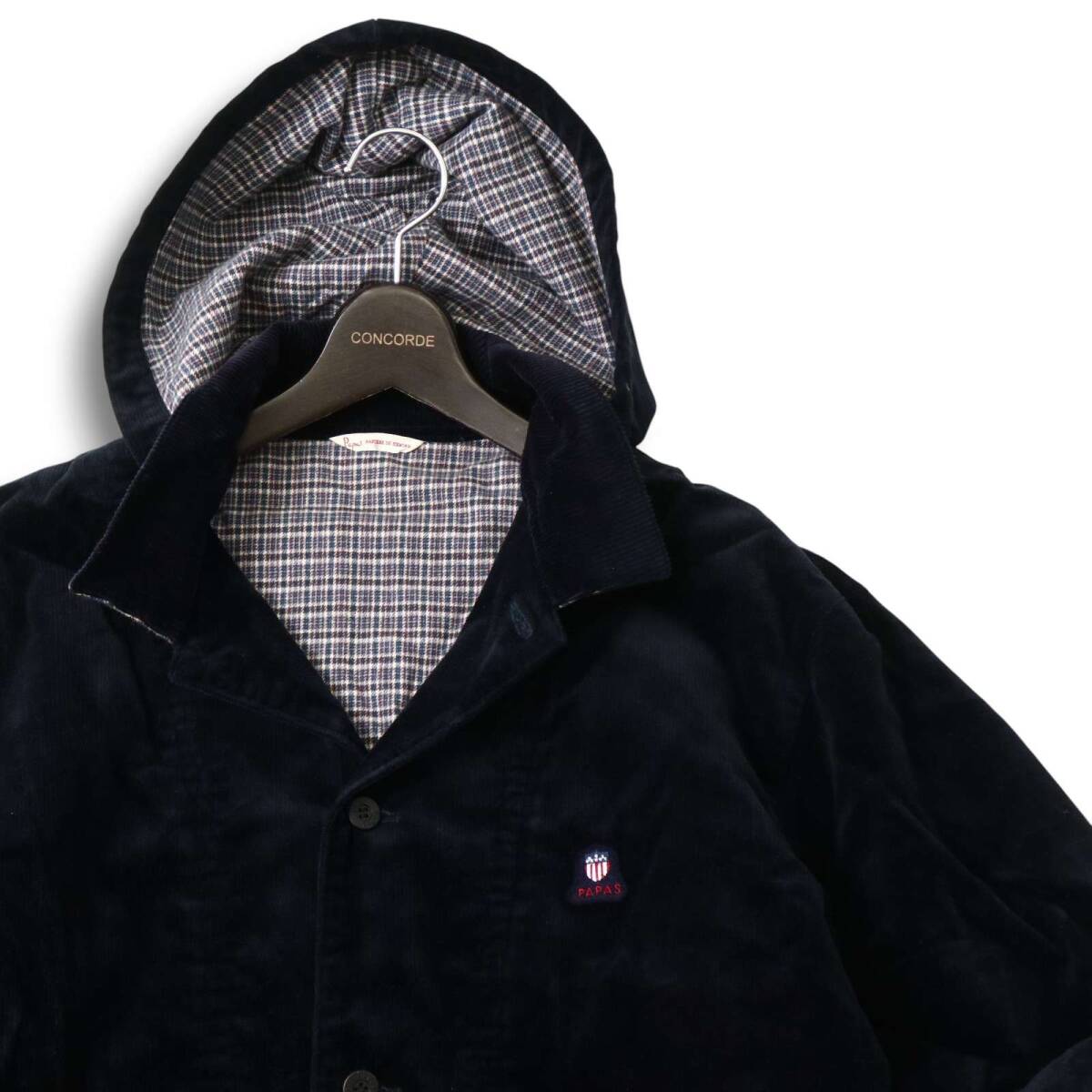 Papas パパス 秋冬 ロゴ ワッペン★ 裏地チェック柄 コーデュロイ フーデッド コート Sz.M メンズ 黒 日本製