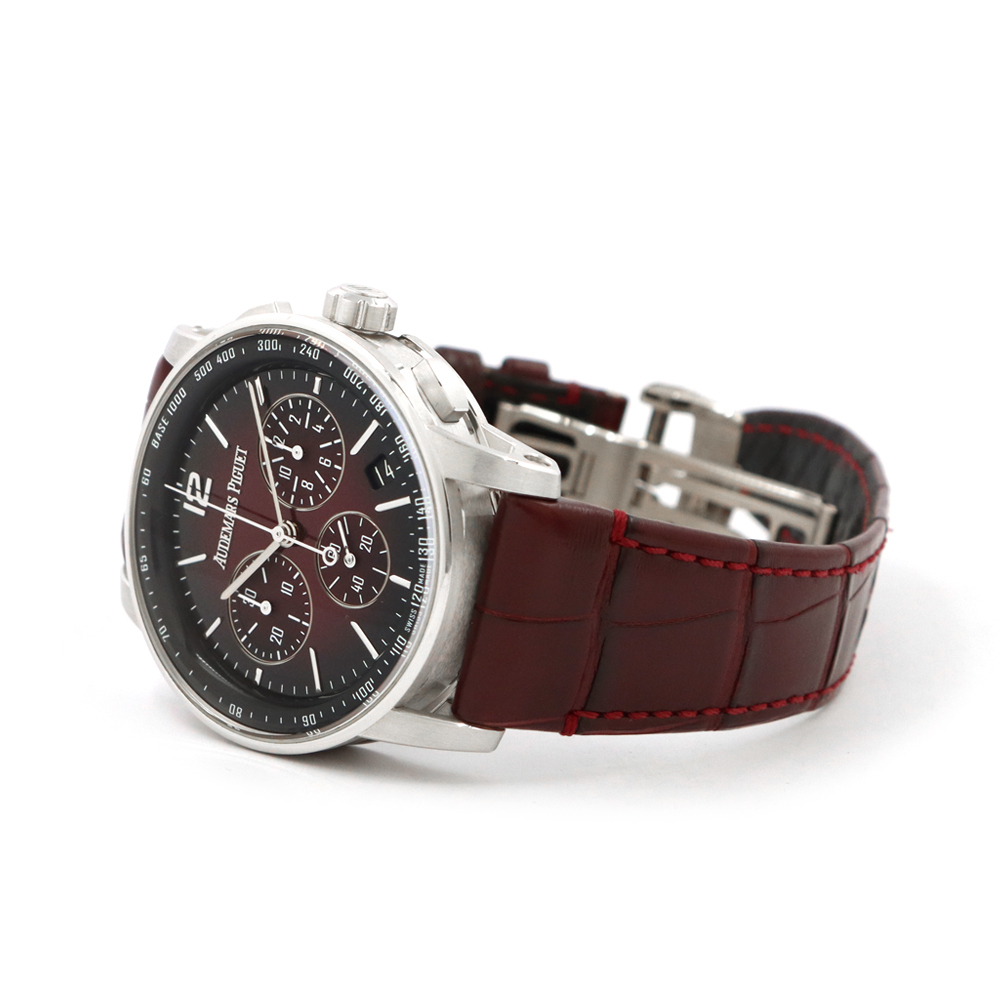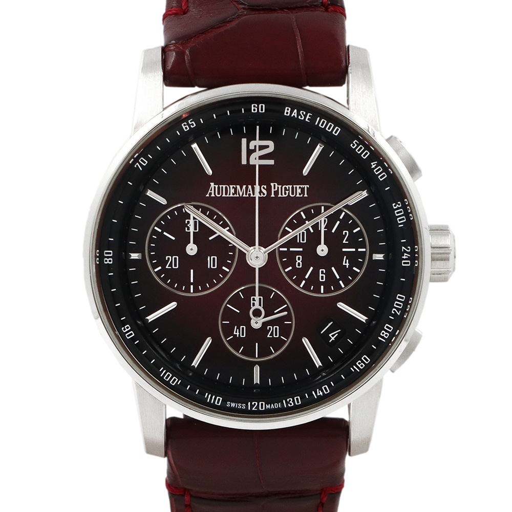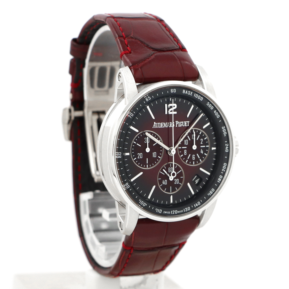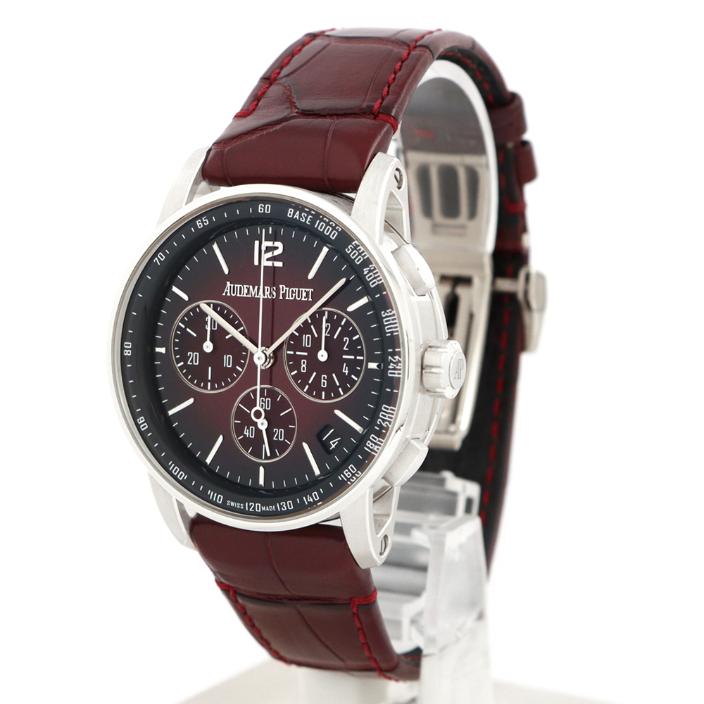 ストラップ:バーガンディアリゲーターストラップ、、18Kホワイトゴールド製フォールディングバックル