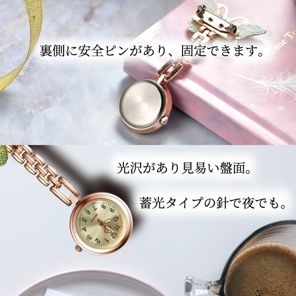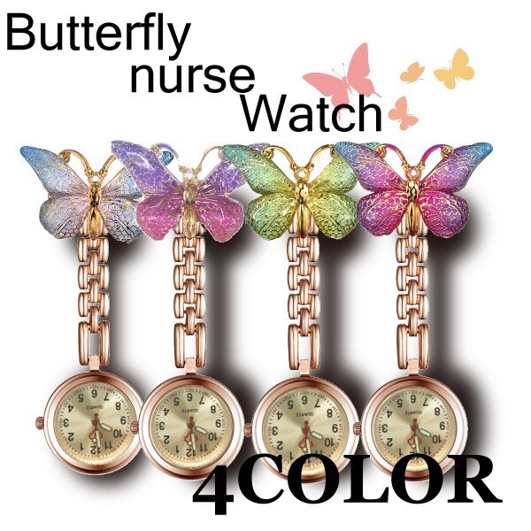 送料無料 ナースウォッチ 蝶々 ピンクゴールド 選べる4色 可愛い 夜勤 安全ピン かわいい バタフライ 時計 ナース 蓄光 蛍光 逆さ時計 夜間