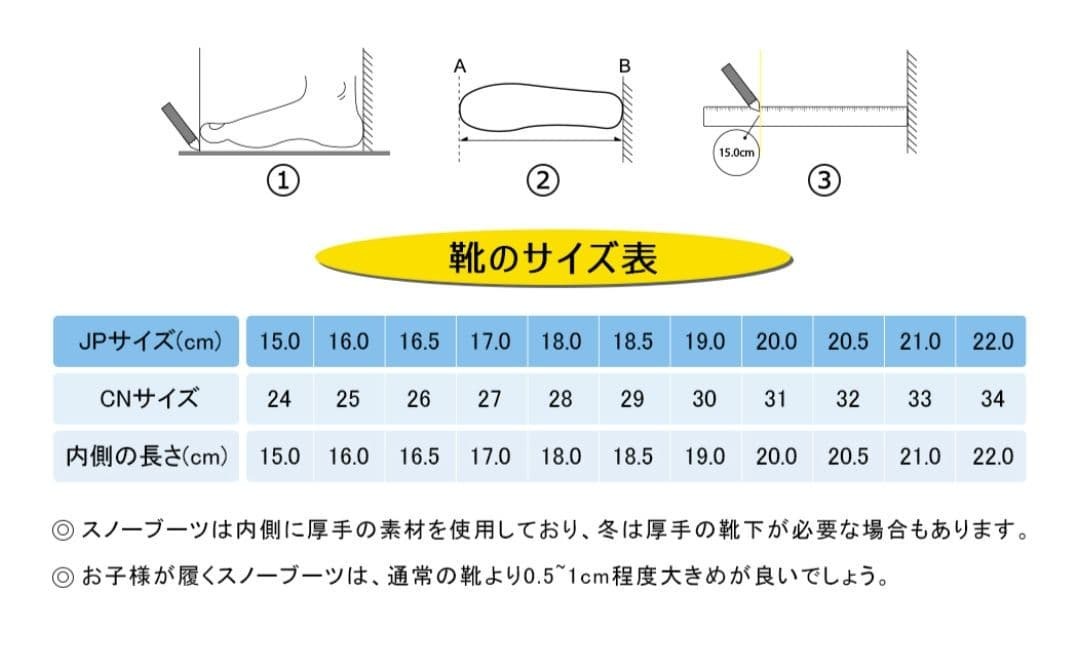 ◎お子様が履くスノーブーツは、通常の靴より0.5~1cm程度大きめが良いでしょう
