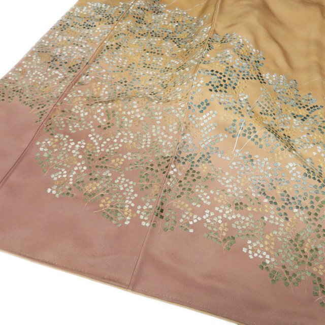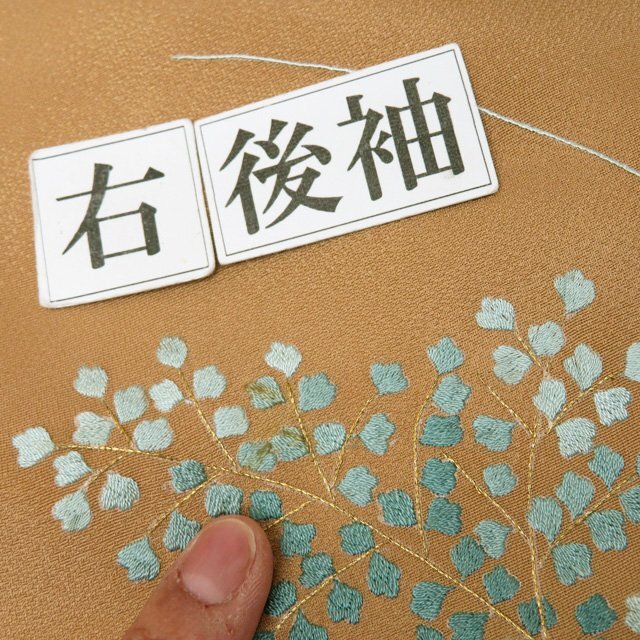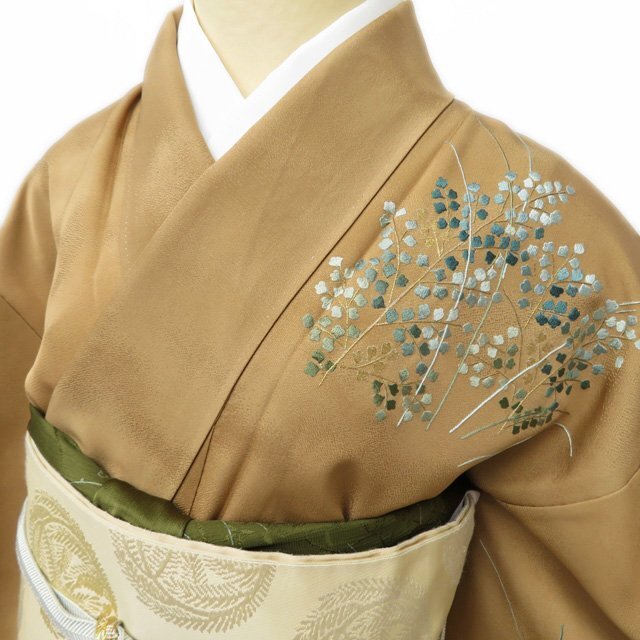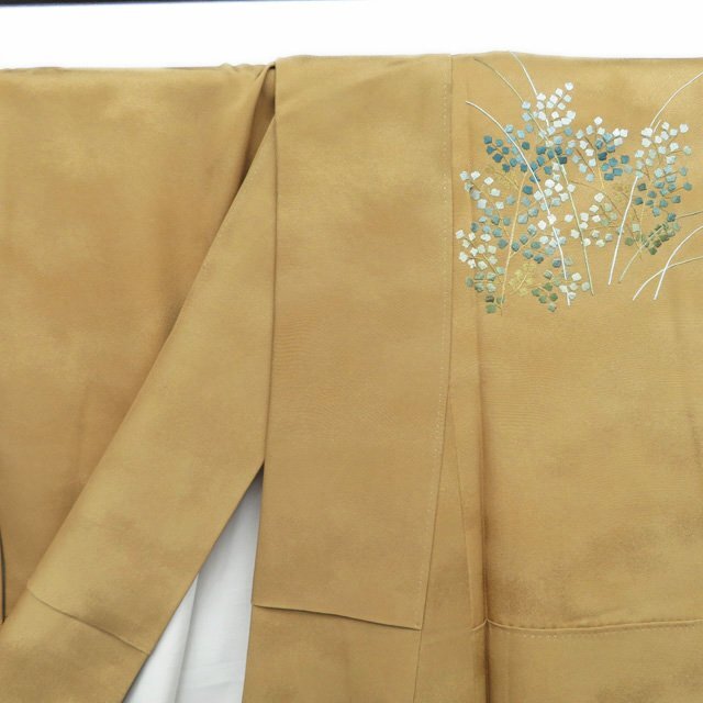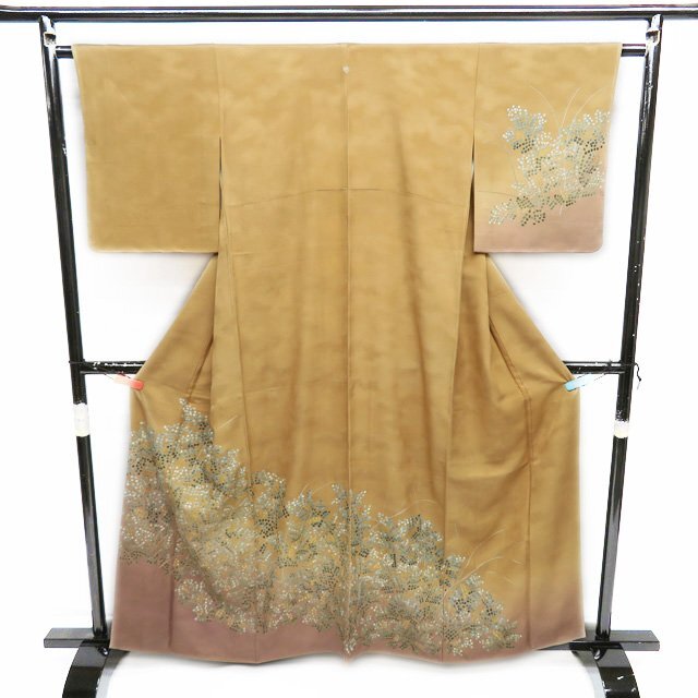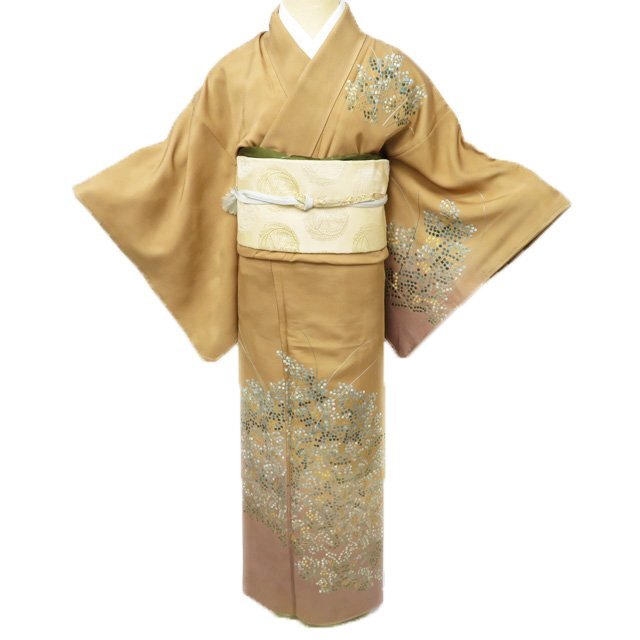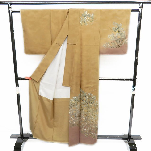 丈160cm(+8) 裄63cm(+5) 袖丈49cm(+3) 前幅25cm 後幅30cm ※サイズのお直し、承ります。 (身丈のみ、身幅のみのお直しは承っておりません) ※身丈は肩から測っております。 ※()内はおおよそのお直しいただける長さです。胴裏の長さ等によって()内の長さ通りお直しできない場合があります。 単位:cm 素材 正絹 商品ランク C ●着用時期 10月~5月(+-2週間) ●着用シーン 披露宴、パーティー、お出掛け、式典など ●お色 小麦色 右後袖にシミがございますが、まだまだご着用頂けるお品物です。 写真に写っている着物のみの販売で、帯等の付属品はついておりません。 一部商品は実店舗・他サイトでも並行して販売しておりますので売り切れの際はご了承ください。 ga | ||||||