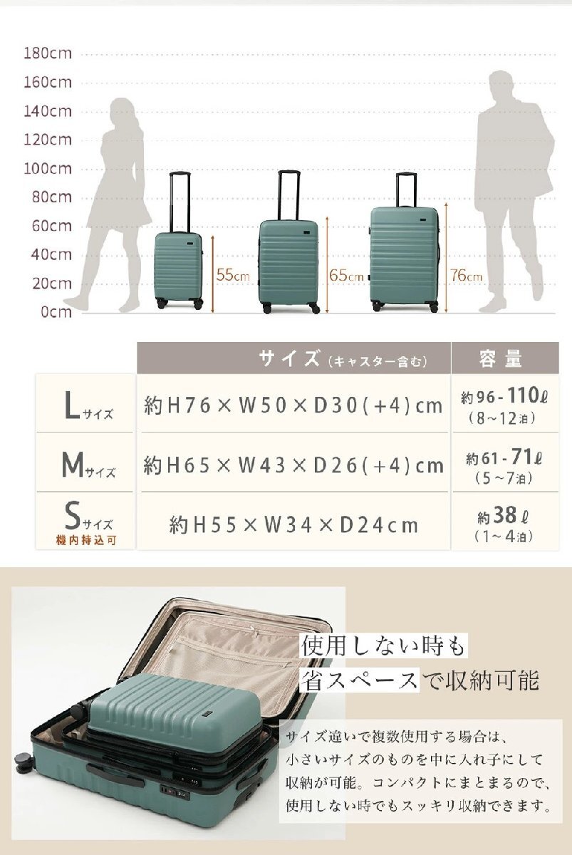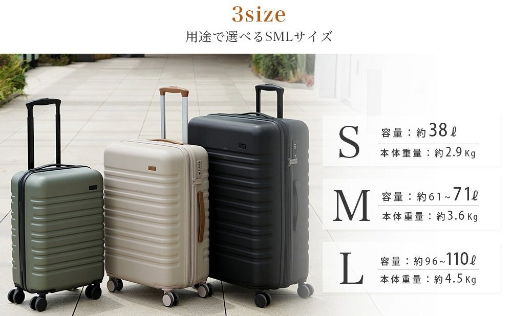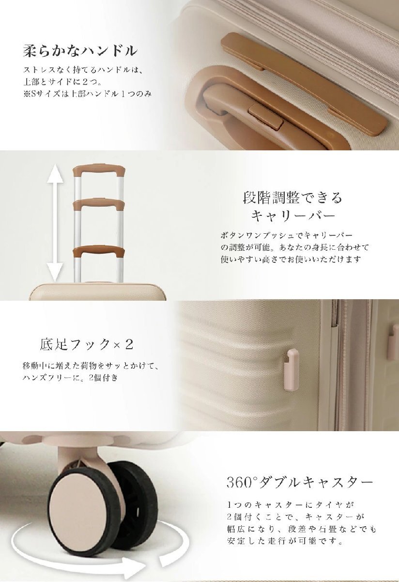 | 本体サイズ (キャスター等含む) | 約縦55×横34×奥行き24cm | 約縦65×横43×奥行き26cm 拡張タイプ(+4)cm | 約縦76×横50×奥行き30cm 拡張タイプ(+4)cm |