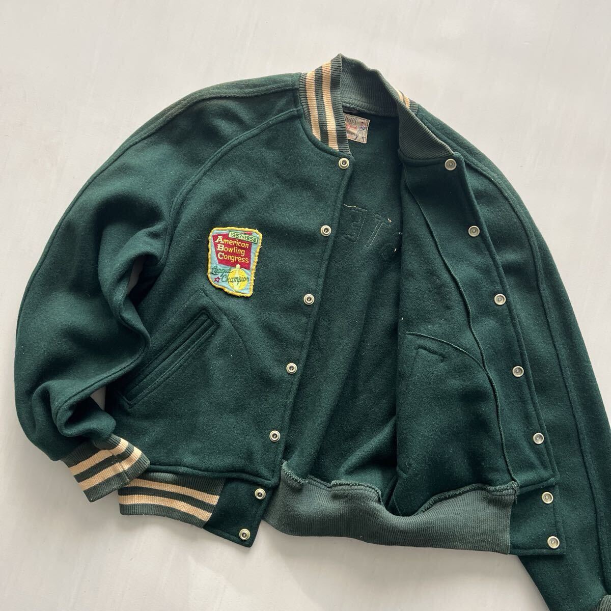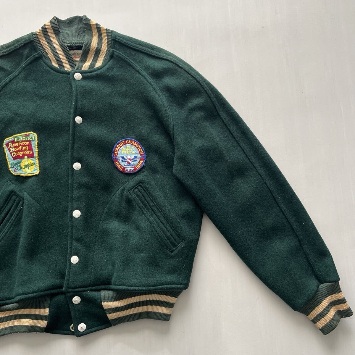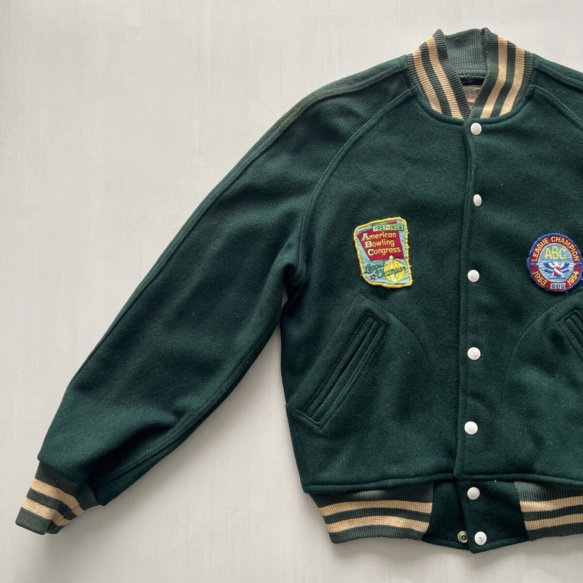 グリーンベースのウール地にワッペンの着く雰囲気ある1着。胸元にはボーリング大会のチャンピオンワッペンが付いています。