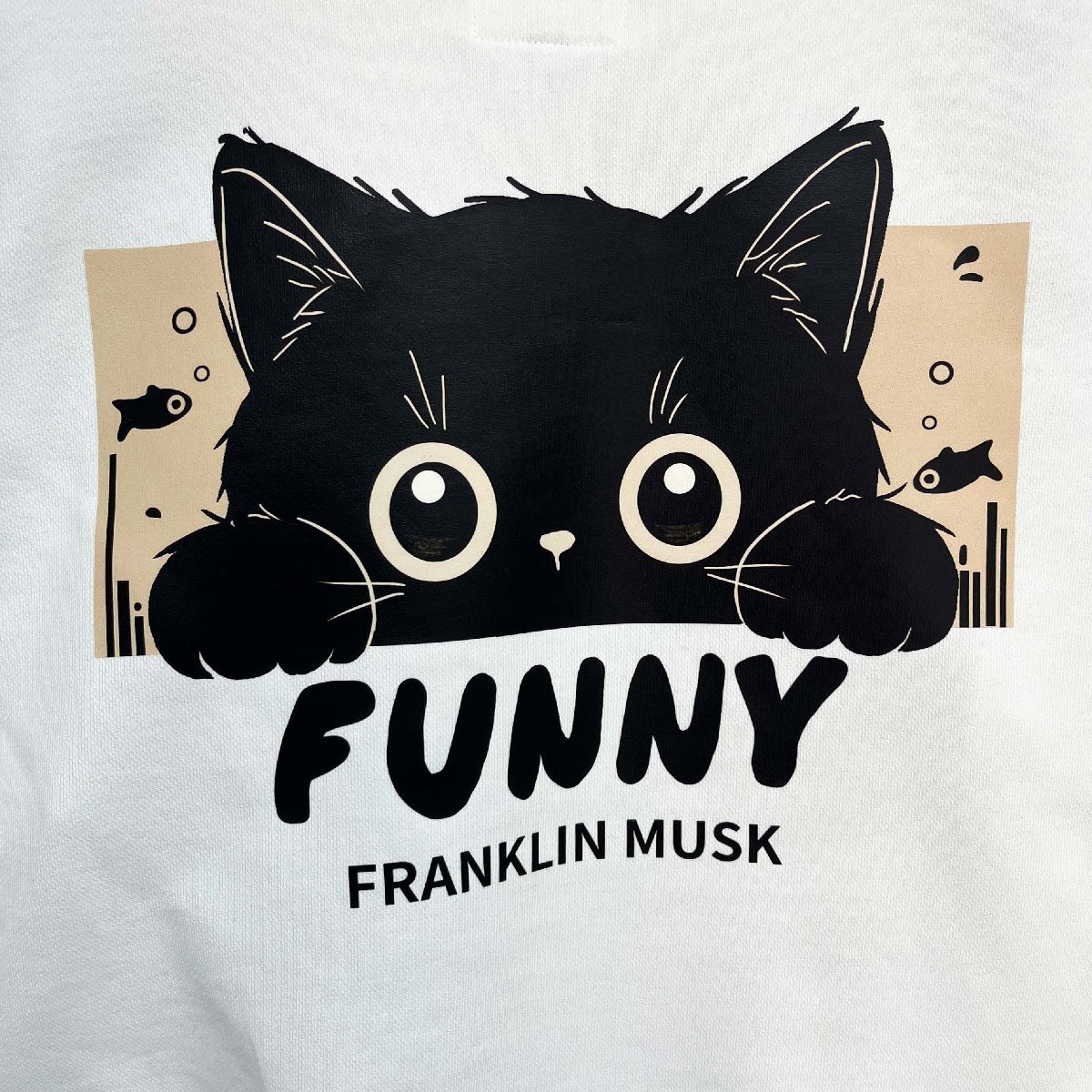 シンプルでクラシックなシルエットに、ゆったりとした着心地の良いオーバーサイズ仕様。胸元には可愛い猫のプリントがポイントに。背面には存在感のある大きな猫のプリントが施され、そのまわりには魚たちが描かれており、ユーモアと遊び心にあふれたデザインとなっています。シンプルでありながら、一着でしっかり主張できる仕上がりです。