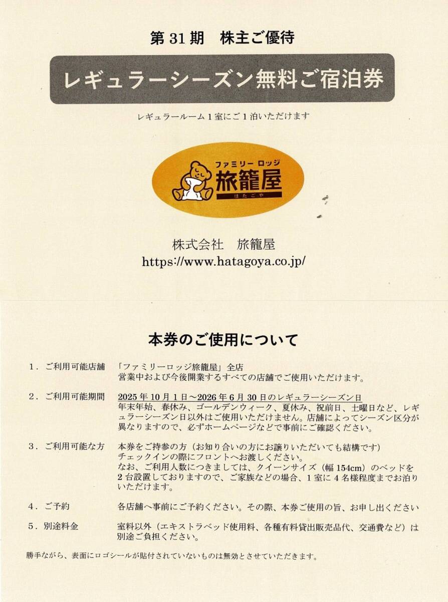 ファミリーロッジ旅籠屋 レギュラーシーズン無料ご宿泊券 2026.6.30まで 株主優待