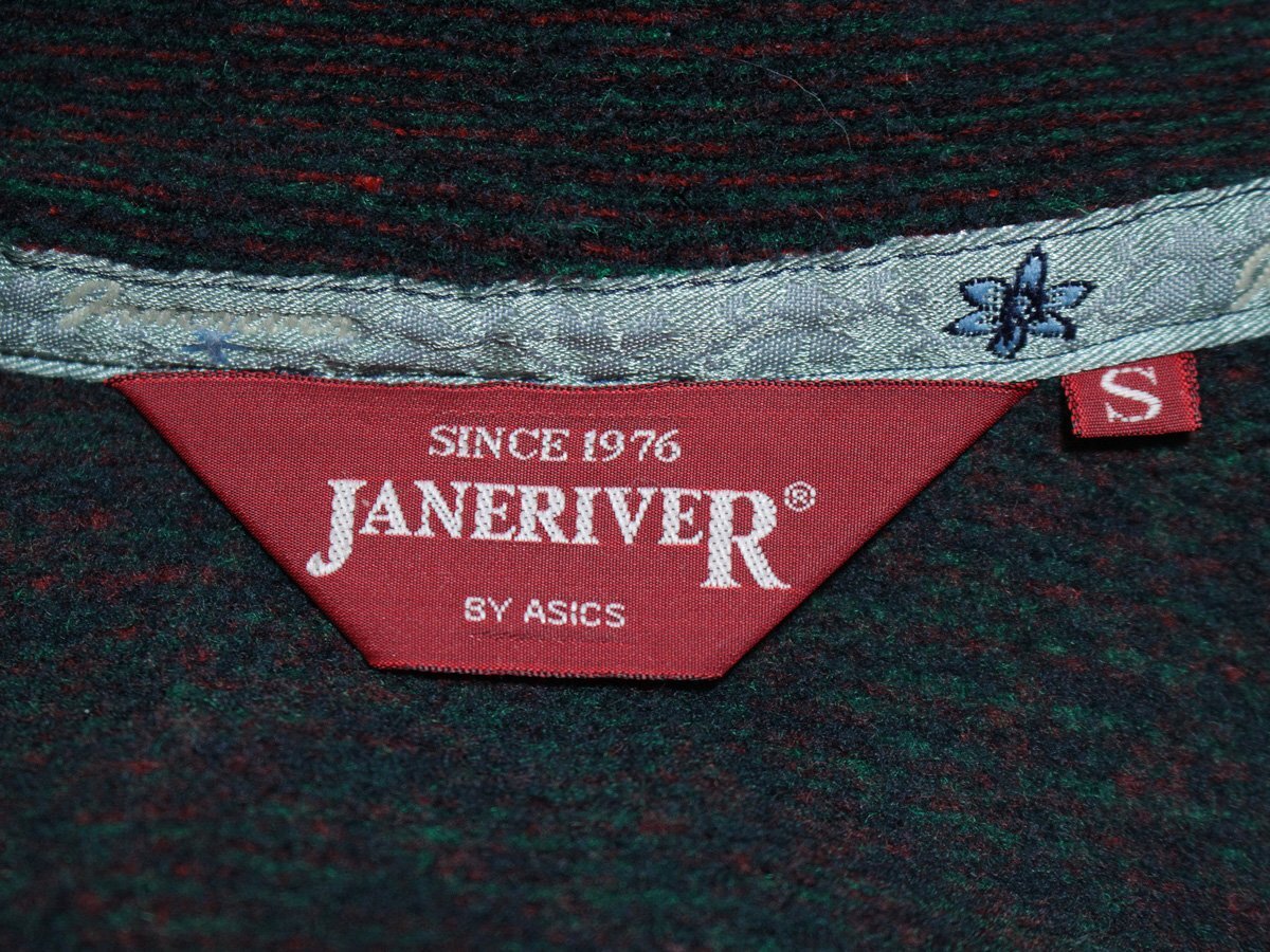JANERIVER ジェーンリバー ジップアップジャケットです。素材はポリエステル75%・レーヨン25%になります。濃緑系の色合いになります。