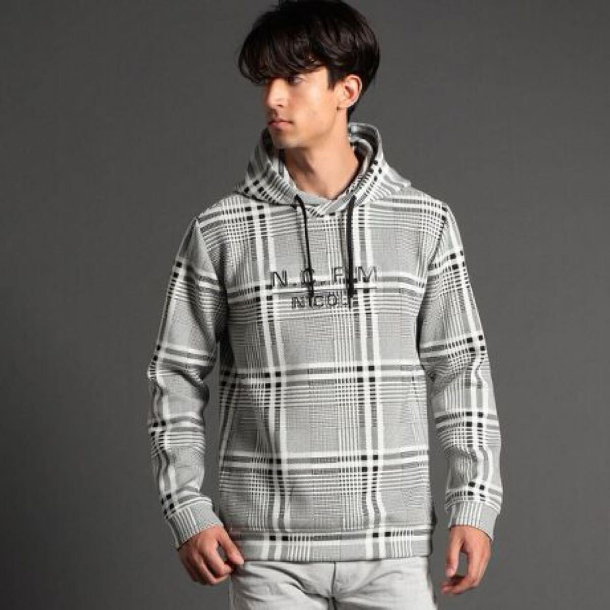 ニコルクラブフォーメンのエンボスロゴダンボールニットプルオーバーパーカ。