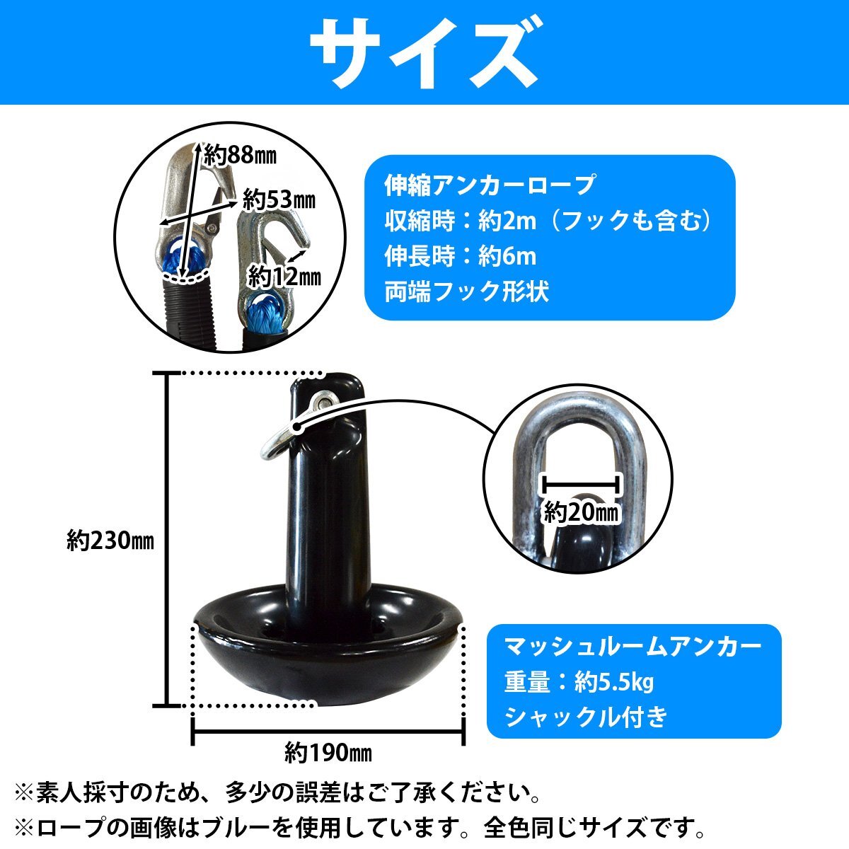 『伸縮ロープ/アンカーセット』マッシュルームアンカー 12LBS 5.5kg 黒 ブラック 6M フロート のびのび アンカー ロープ 黄色