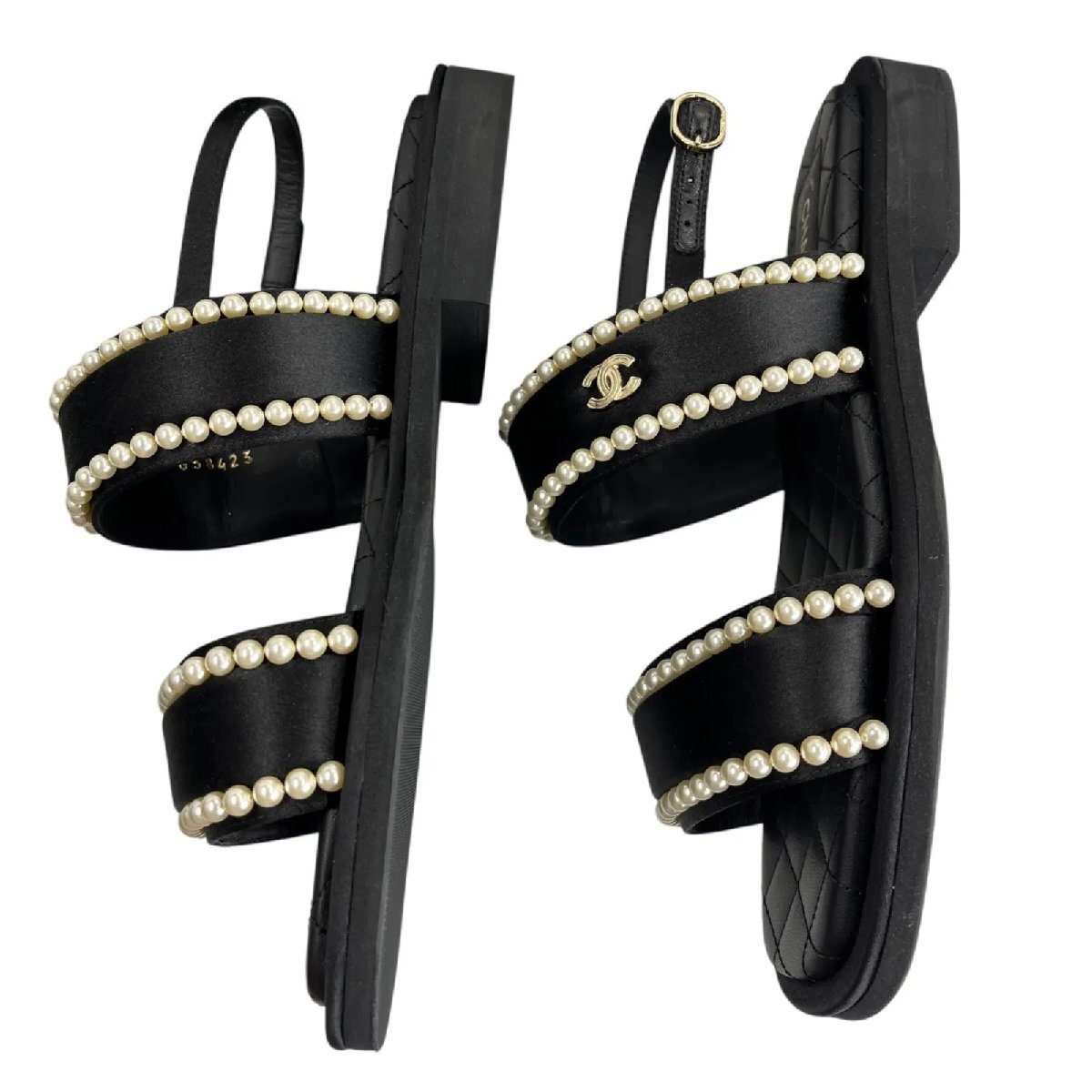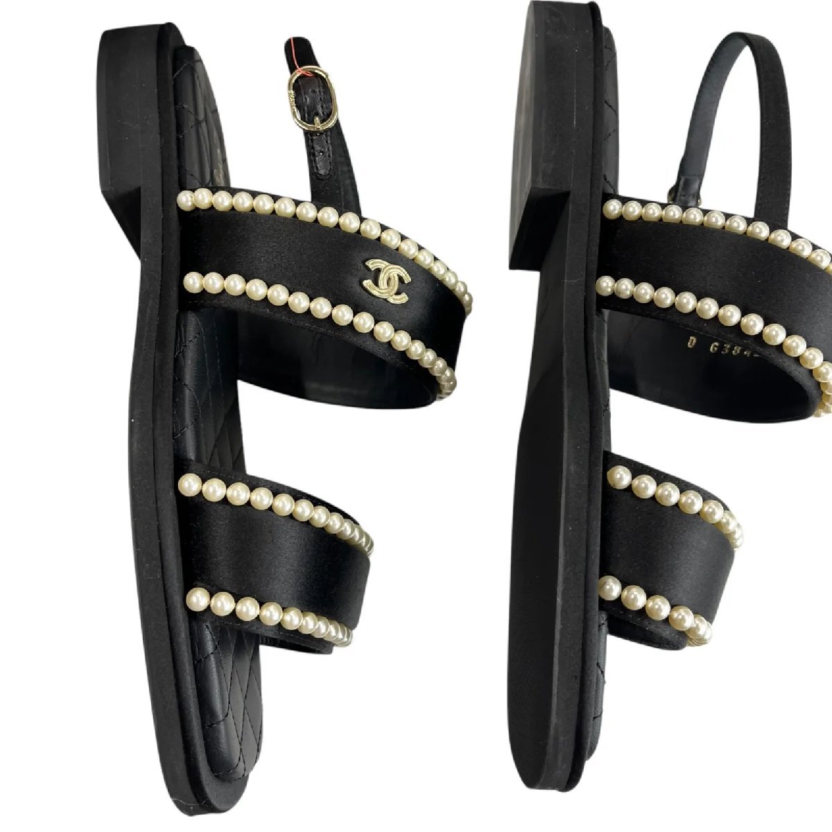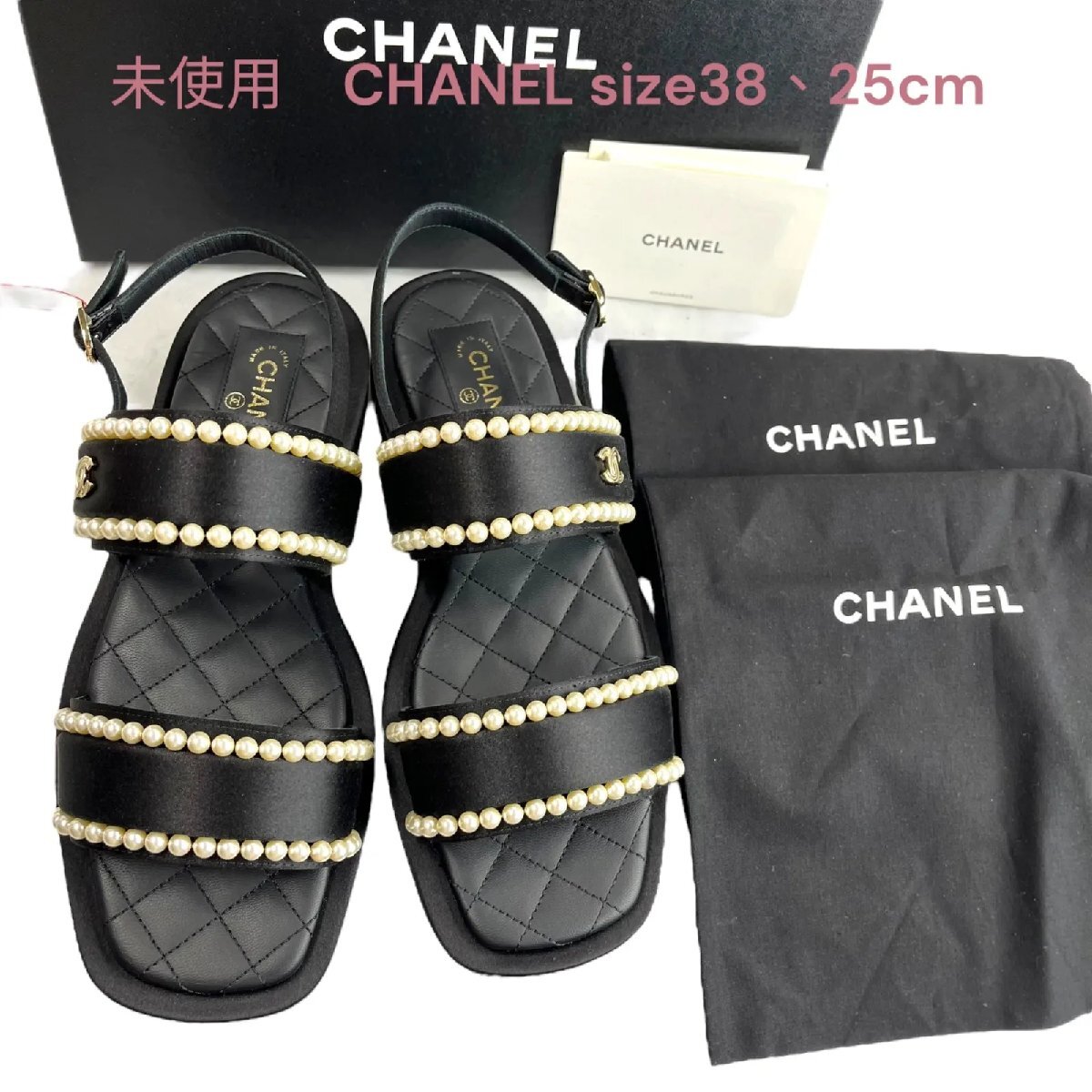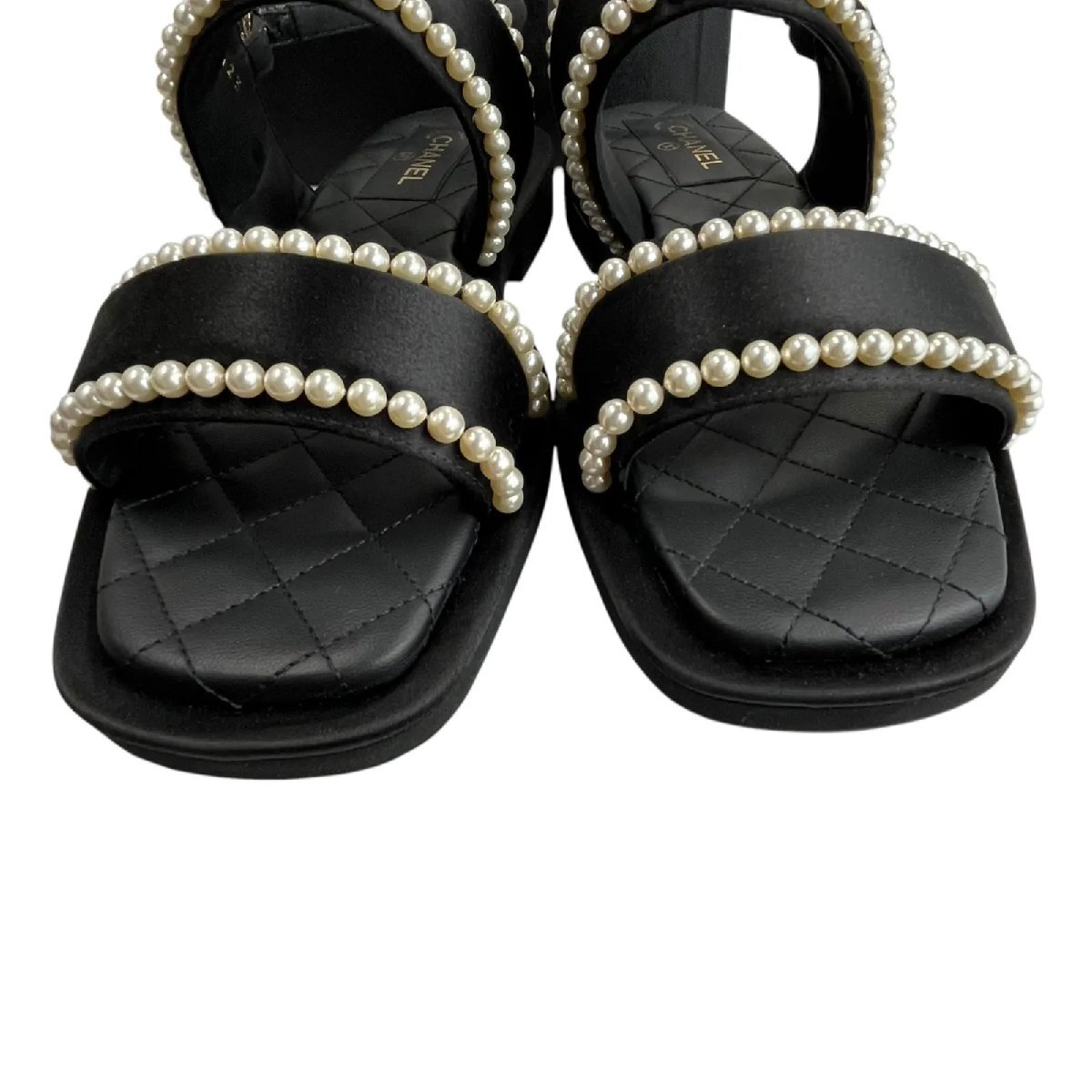 ●未使用 シャネル CHANEL ココマーク パール サテン サンダル ブラック 38、25cm レディース S5P133