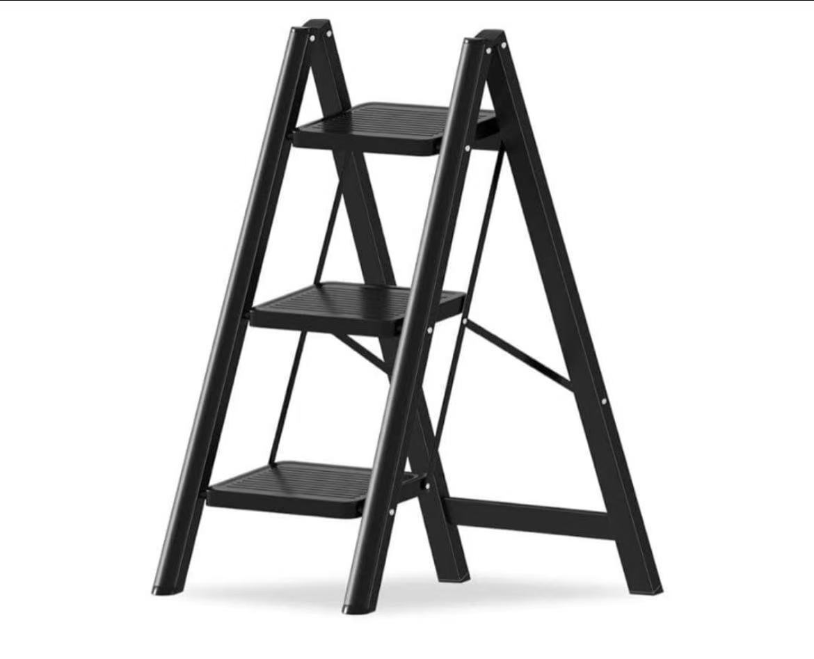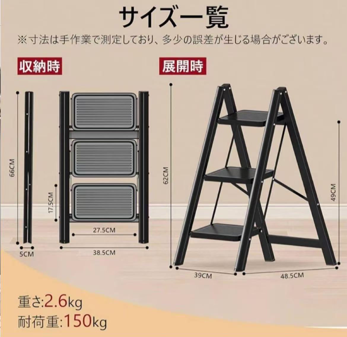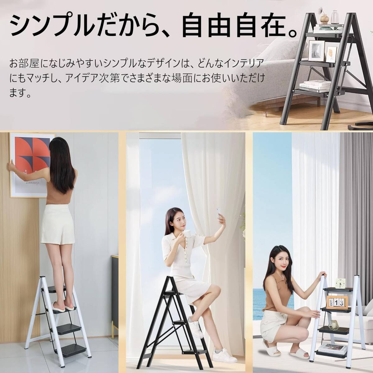 狭い場所でもスッと収納可:折りたたみ時の厚さはわずか5cm,一般的な脚立より約20%スリムで、日本の住宅事情にぴったりの省スペース設計です。ドアのすき間、クローゼットの脇、洗濯機の横、または壁に掛けての収納も簡単。広げれば段差付きのステップ台として、「高所作業・簡易スツール・ちょっとした物置き」とマルチに活躍。1台で家事効率も大幅アップ!