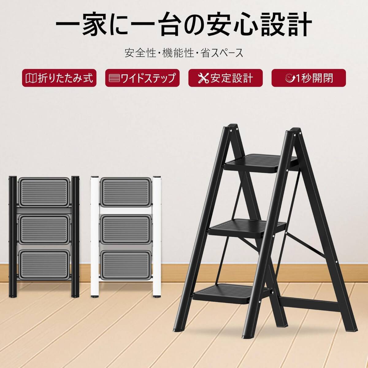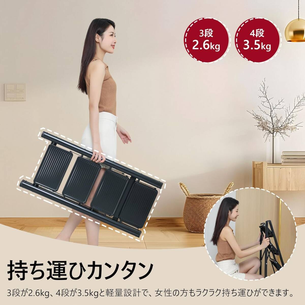 軽さと強度を両立した設計:フレームには航空グレードの高強度スチールを採用し、「軽さ」と「頑丈さ」の両立を実現。脚立本体は約3.5kgと軽く、片手でラクに持ち運べます。女性やご年配の方でも移動・展開がスムーズ。各接合部には荷重を分散させる補強構造を取り入れ、耐荷重は150kg以上。上段に立ってもグラつきにくく、高所作業でも安定性があります。