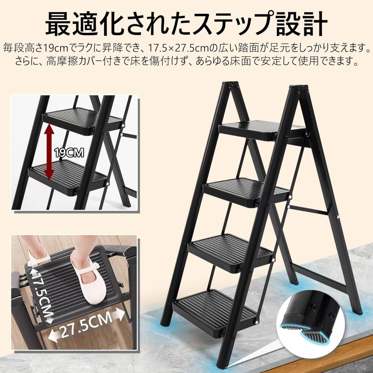 幅広ステップで快適に使用:踏み板は22×18cmのワイド設計で、足裏全体をしっかり支え、長時間の作業でも疲れにくい仕様。踏み台は1段あたりの高さはわずか16cmと低く、上り下りがスムーズで、足腰への負担も軽減されます。脚力に不安のある方やご年配の方でも扱いやすく、「安定性」と「快適さ」を両立した使いやすい設計です。
