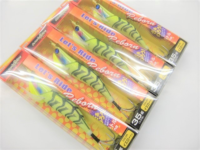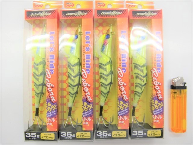 | 商品説明 | 新品のレッツライド リボーン3.5号(35g) 4個セットになります。 カラーは全てイエローゲットになります。 ライターは大きさを比較する為に使用した物で付属はしません。 詳しくは画像を参考にして入札して頂く様お願い致します。 リアルヘッド装着 3本針でバラシ軽減 音と振動で強烈アピール タコエギ専用シンカー装着 どんなタコにもアピールバツグン!! |