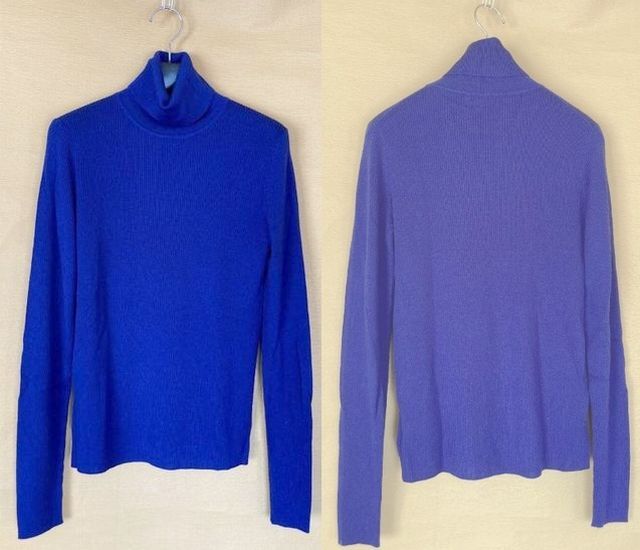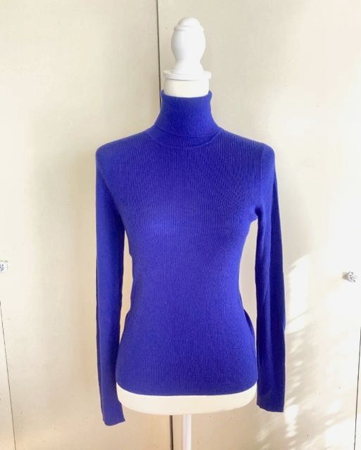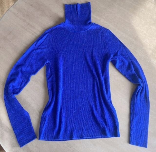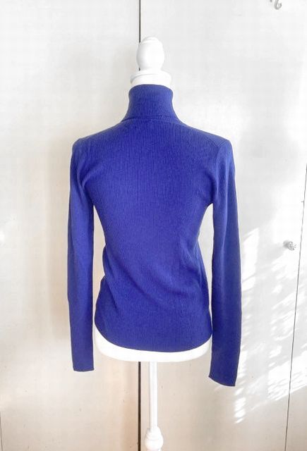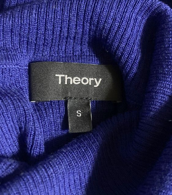 THEORYの明るめネイビーのリブ編みタートルネックセーターです。