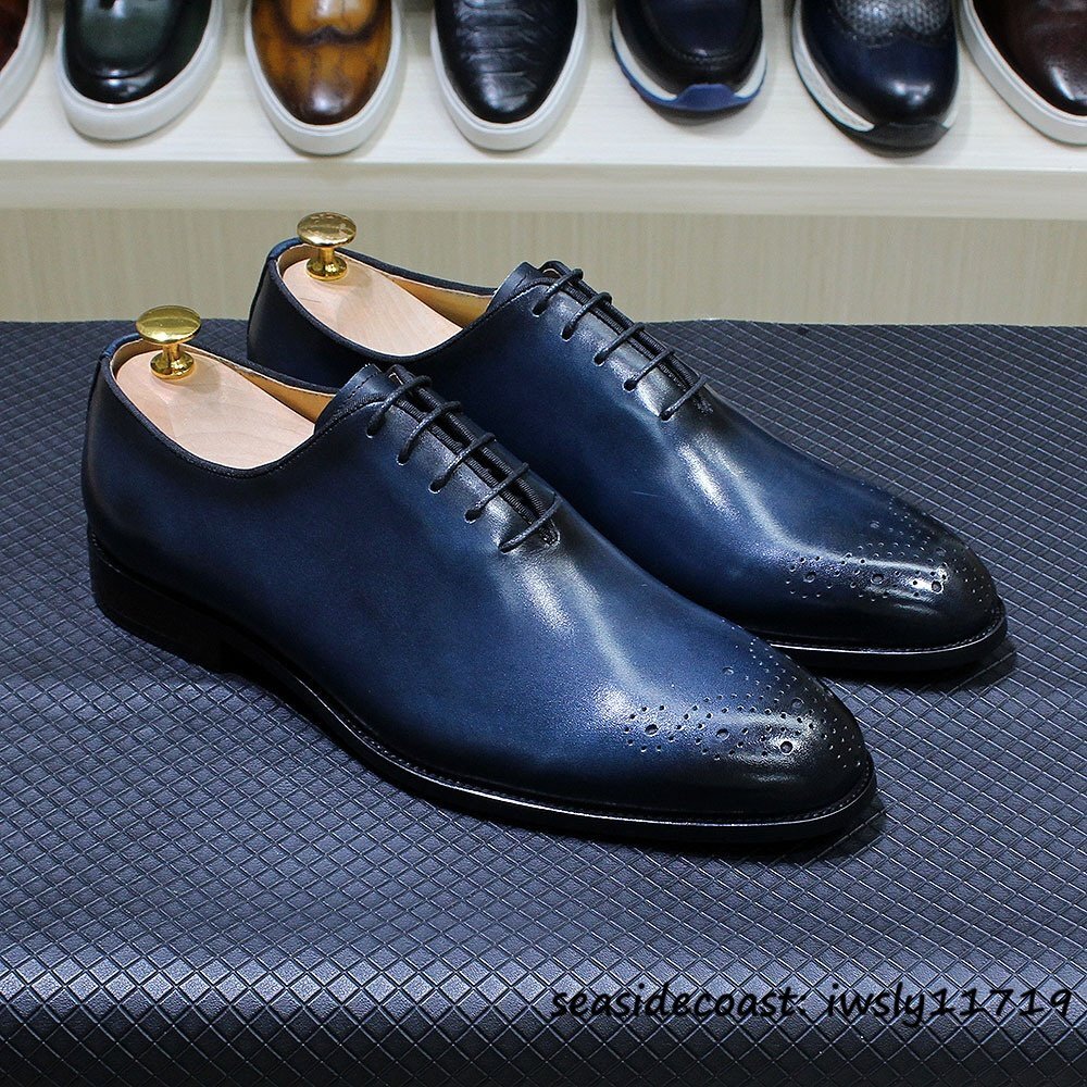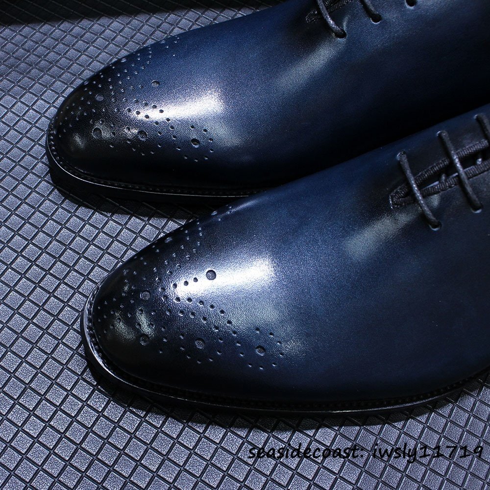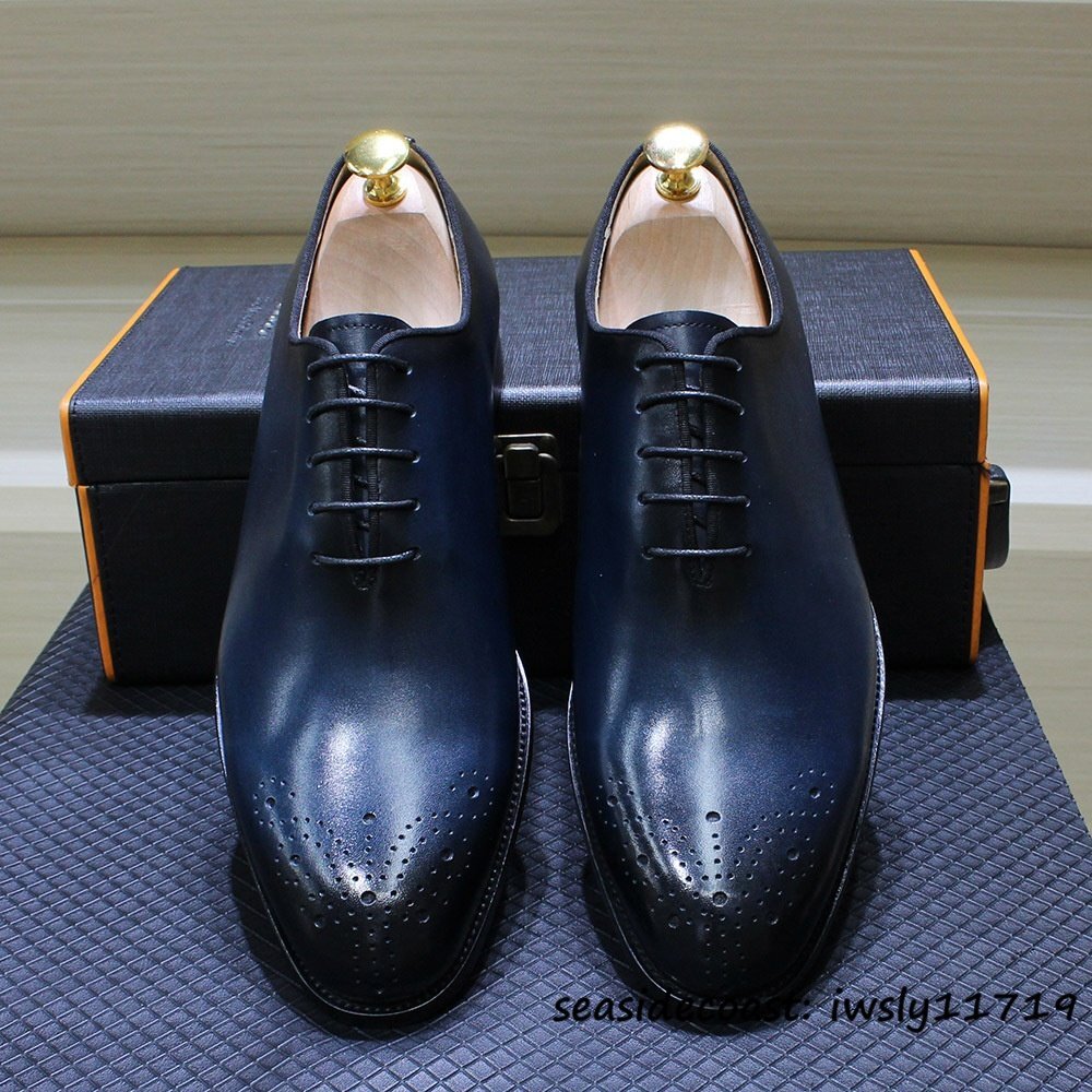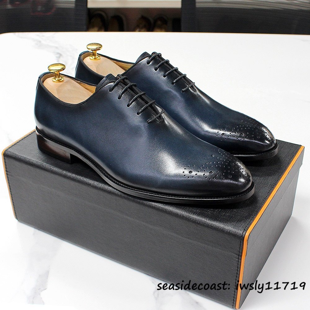 定価9万超■本革 レザーシューズ メンズ ビジネスシューズ 職人手作り 彫り 紳士靴 革靴 ドレスシューズ フォーマル 新品 ブルー 26.0cm